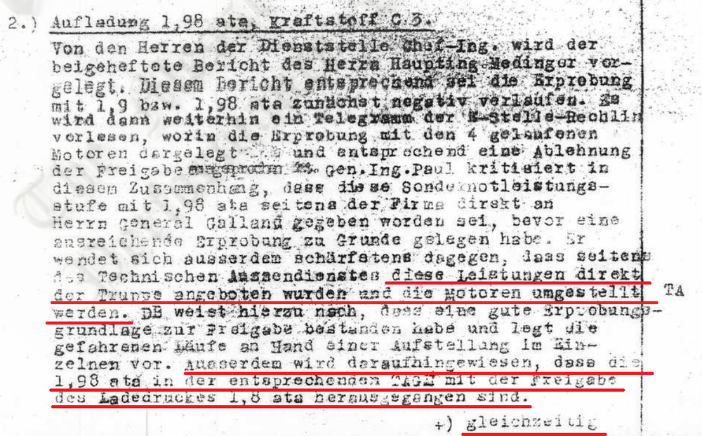 It refers back in past tense to past events, i.e. that "DB adds that a good test basis had existed for the clearance and specifies the course of the completed test runs on a list in detail. It should also be noted that 1.98 ata have been released in the corresponding TAGL at the same time as the clearance of the 1.8 ata manifold pressure." I.e. the 1.98 ata rating was cleared for the DB 605DB/DC in the 1st December 1944, 3rd edition of the 605D engine manual (" 'Entwurf einer vorläufigen Motorenkarte 9 - 605 DB u. DC, Ausgabe C, Stand: 1. Dezember 1944'"), and to qoute verbatim the previous document, at the same time as 1.8ata rating for the same engine in DB configuration. The relevant page scanned from the 1st December 1944 DB 605DB/DC manual: Which was, to qoute again verbatim the document "...seitens des Technisches Aussendienst diese Leistungen direkt der Truppe angeboten wurden und die Motoren umgestellt werden...." or in English '...these outputs were on the behalf of the Technical Service promulgated directly to the troops and the engines were converted...". Crystal clear, isn't it. Name those Mark IX Squadrons then. Operating on 150 octane fuel. In 1944. Now as for the fantasies of wwiiaircraftperformance on 150 octane fuel. Who cares, really. Their own documentation do not support their claims. They also claim that 1.98ata did not see service... then, as in an absurd comedy they link the 'evidence' to that, the very document that I just qouted and which says in clear terms ''...these outputs were on the behalf of the Technical Service promulgated directly to the troops and the engines were converted...". :megalol: Same with 150 octane. Those '16 Squadrons' are a mix of Mosquitoes, Mustangs, Tempests, the four XIV Squadrons, ... and the 2 (two) Mark IX Squadrons (Nos 1 and 165) involved in operational trials for half a year and which were almost immediately pulled from diver operations as they lacked the low level performance of Tempests and Mustangs to catch the V-1s. They used to post the +25 lbs trial curves for the XIV as evidence that +25 was cleared for the Griffon, only that the same doc also states that the engine failed after 2 minutes on that boost and had to be replaced, while subsequent documents, even those from September 1945 all unequivocally state that the Griffon is facing main bearing troubles and at best, +21 lbs is the maximum permissible.
