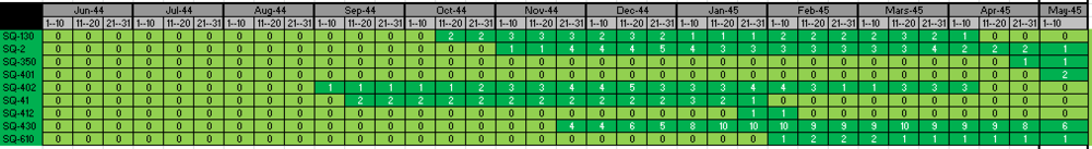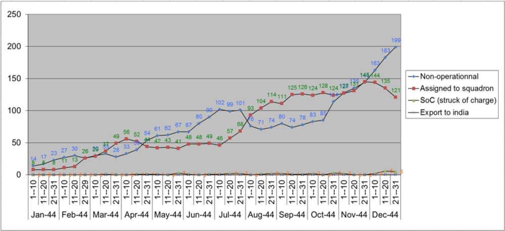 Two flights of 4 planes in No. 610 Sqn... this should put the XIV's operational role in context - number assigned in 1944. Note that the RAF's fighter Squadrons contained 20 aircraft at the time, with 12 flying and the rest being immidiate reserve aircraft. Graph data was compiled by JV69badatflyski. Number of Mk XIVs issued to Squadrons.