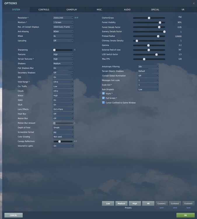 Yea I wish mine were that smooth. Running prettty easily at a VSYNC 60 fps with the 'theoretical FPS' generally in the 200-300+ range. Also I notice you were jinking around quite a bit - if you still in a stable turn and let the cloud reflctions update you will prob notice it better. Captured a small video on the Caucasus IA Free Flight. It seems to just be the cloud reflection updates, as when I get above them the gauge reflcetions look fine. The same slow update is in all the gauge glass so engine gauges etc. - and when it is in all of them at once it is pretty bad! Not to be rude but I don't agree with your 'obviously' comment above, as I would happily set reflection update to a higher setting if I had the option and would easily manage it. I am sure this 'used' to be an option in graphics setting in the past - reflection update on the instruments and MFD screens - could be wrong, might be thinking of another Viper sim. I just notice now it is 'static' or 'OFF' which seems different (been away from DCS for couple of years). Attached a screenie of my graphics settings also. By all means if I have a setting incorrect that is causing this, please advise. Cheers Reflection.mp4
