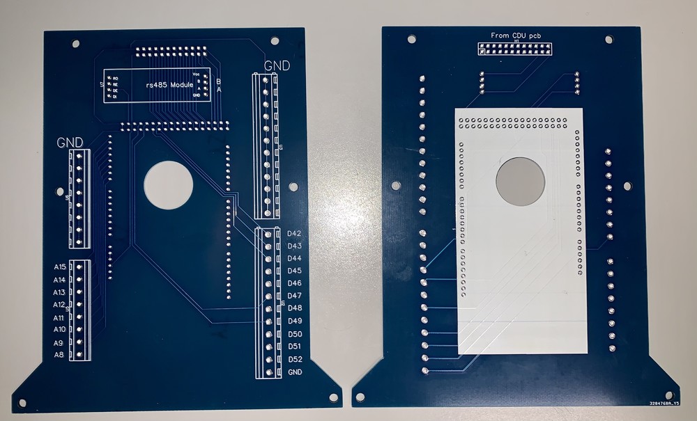 Apologies for the long delay, here’s the connections board that will connect to the keyboard pcb via standoffs. Has the arduino mega, rs485 board, power input, and moves the unused pins to the edge so they are easy to get to. This is designed to have a display module attached via a cable routed to the correct spot on the CDU board. I'll probably use long pin headers through the board for that purpose.