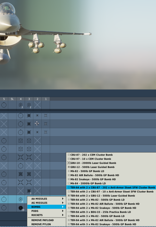 13. Screenshot below shows that when selecting bombs, the single CBU-87 and CBU-97 are both labeled as "CEM Cluster Bomb" while both the TER-9A with 2x CBU-87 and TER-9A with 2x CBU-97 are labeled as "Anti-Armor Skeet SFW Cluster Bomb" I believe the CBU-87 is the CEM and the CBU-97 is the SFW regardless of whether it is mounted on a TER-9A. Correct? Conditions: Single player mission, Caucuses, USA F-16 bl. 50 with as task of CAS and set to Player