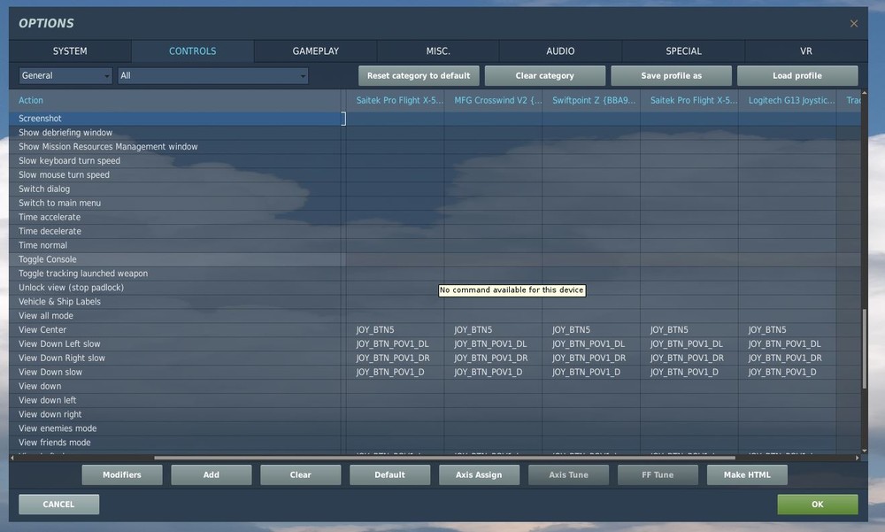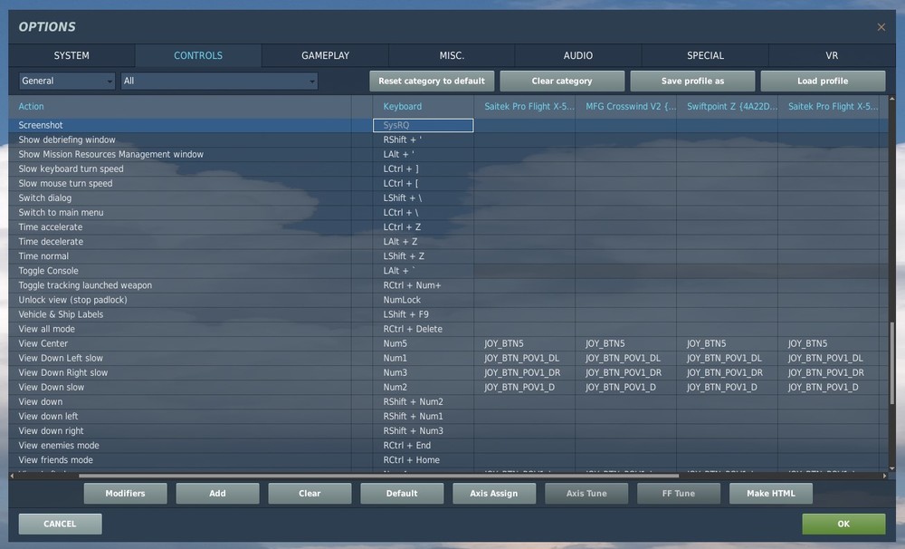I have three monitors with resolution at 5760 x 1080 using Nvidia surround and the center monitor is nearly 3 feet from my operating position which is difficult to see clearly, Being able to move and scale the user controls interface would be a big plus. Is there a way to have the USB device columns set the way the end user would like for editing. Example the first column Saitek X55 Throttle, second column Saitek X55 Stick, third column Crosswind Rudder Pedals and ignore the other devices along with clear category? The current User Interface is not very user friendly. Maybe develop a standalone module for editing the controls and functions.