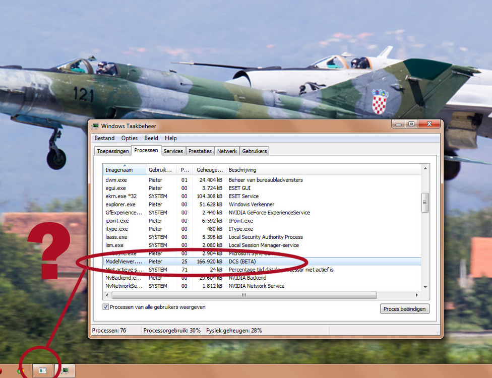 Please help, I am desperate! It was on a sunny saturday morning that I was busy with a polish MiG-21 skin. I use the Nvidia DDS tools to generate a *.DDS file and I use the standalone modelviewer. I have to close the EDMviewer after a minute or so because it makes the core temperature of my CPU go berserk. So I close and re-open the modelviewer all the time. But for some reason, it doesn't work anymore. If I start the modelviewer, it just sits in the windows taskbar, looking all minimalized. When I click on it, it doesn't pop-up. It just sits on my taskbar and does nothing. This bug happened while I was working on the skin. One minute it opens, and the next minute, it won't open anymore. I tried downloading the most recent version, but no joy. I also updated the drivers to my Geforce card. :cry: I've provided a screenshot below. Can somebody help?