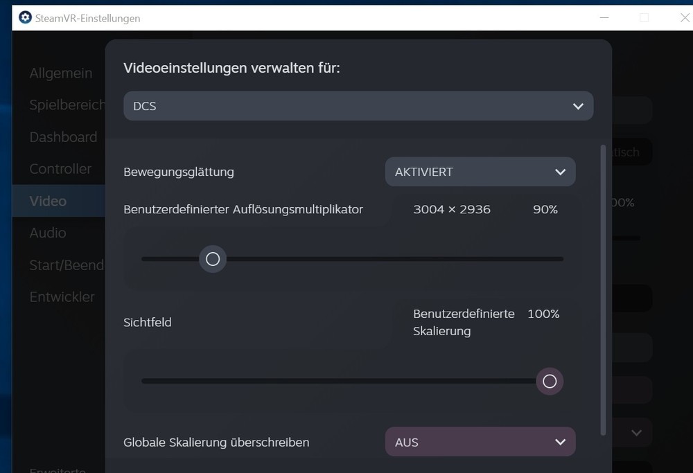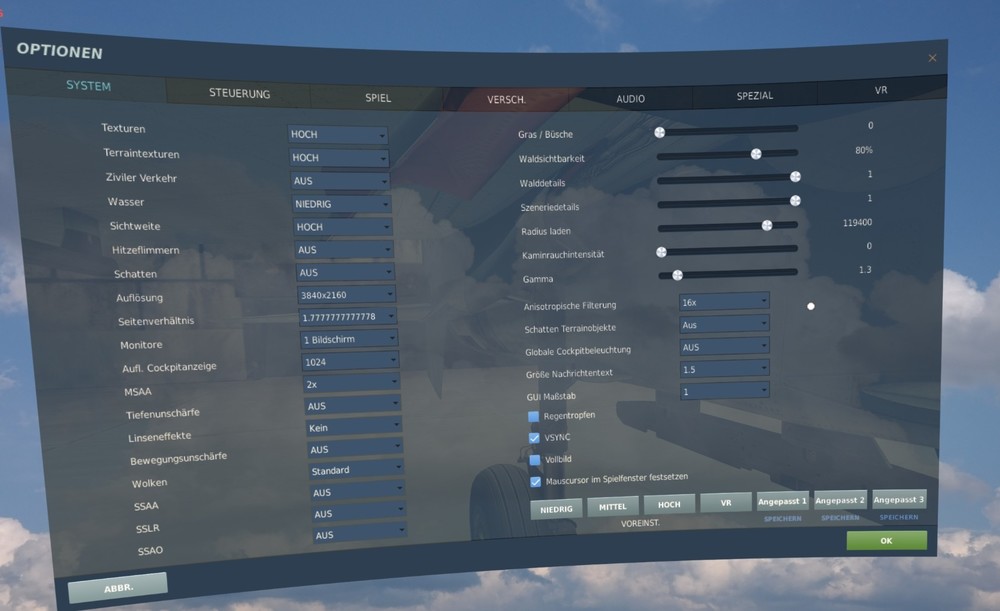 Moin, Moin! Da ich meistens nur am Wochenende zu Hause bin und Zeit habe mit den DCS-Einstellungen zu experimentieren, hier nun meine Einstellungen die mir ein ausgewogenes Spielerlebnis bescheren. Ich bin kein FPS Freak und schon zufrieden wenn ich flüssig (mit ausnahme einzelner Microruckler) spielen kann. Ich habe auch bei gut besuchten Servern (20 - 40 Personen) eine FPS zwischen 30 - 50. Mein Rechner enthält folgende Hardware: Processor: Intel Core i7-7700K @ 4.9 MHz Motherboard: ASUS STRIX Z270F GAMING Module: 32 GB Kingston DDR4 @ 2400 Video: GIGABYTE NVIDIA GeForce RTX 3080 10 GB Monitor: SAMSUNG U28E590 @ 4K Other: HP Reverb 2, TM Warthog and some SSD/NVMe drives Der Prozessor ist per BIOS höher getaktet mit einem festen Multiplikator. So habe ich frühere Microruckler beseitigen können. Im Anhang die Screenshots die Selbserklärend sein sollten