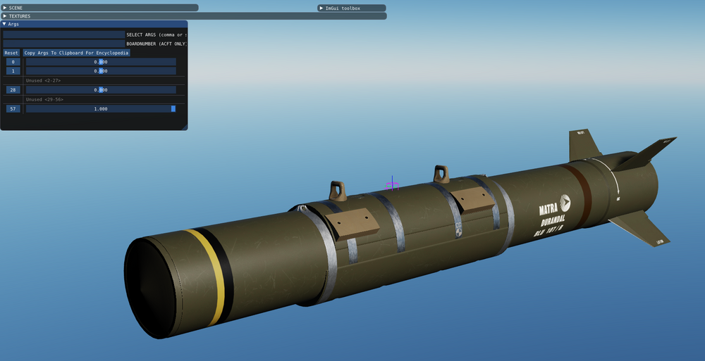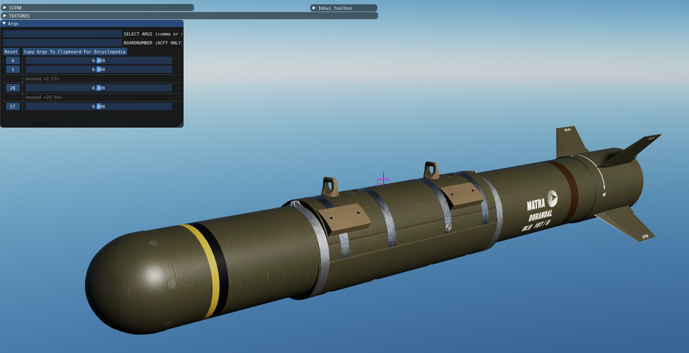 @Santus faster than me eh The tip-tanks are not jettisonable, so they are included in the main external 3d model MB-339.edm. You can play with the slider of the argument 525 to switch between the visibility of two types of tip-tanks, elliptical and cylindrical. -