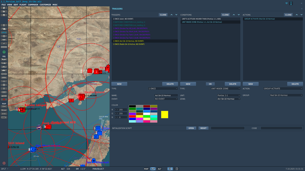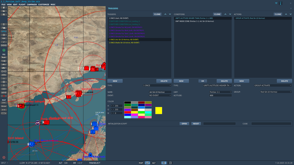 Hey guys, I'd need some help here... I set up a deep strike mission and want an SA-10 to go active when I'm within its radius AND above a certain altitude. So basically I can fly through its firing range by going low without activating it. I set up a trigger zone correspondingly to its firing range and a trigger 'within zone' OR 'unit above x feet'. Obviously that won't work because the 'within zone' condition will trigger it active anyways. What I'd need is an AND option not OR. I'm sure there is a workaround... just not seeing it. Thanks in advance!