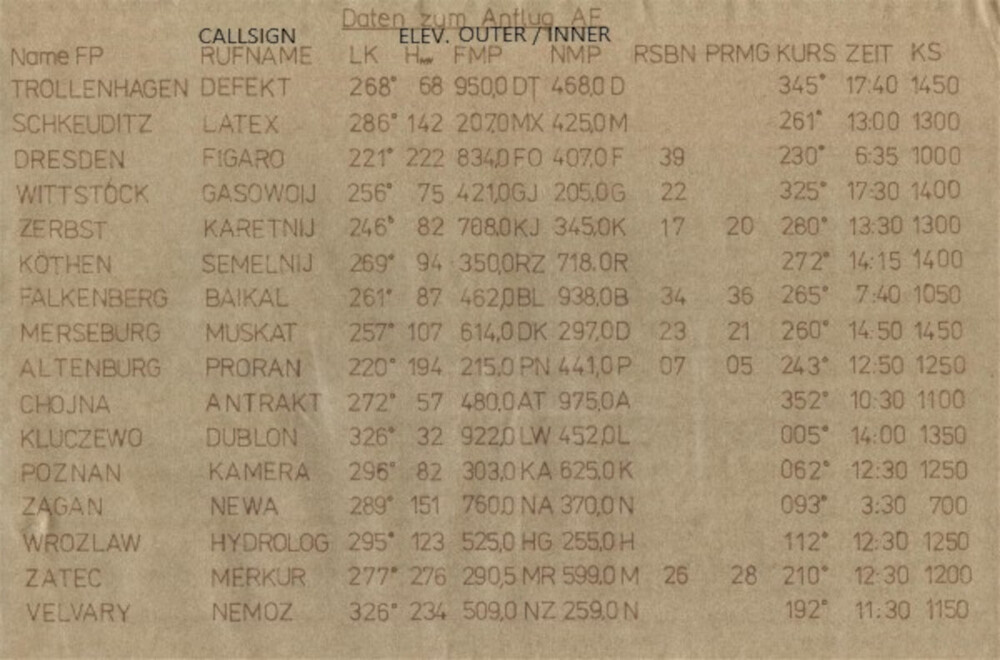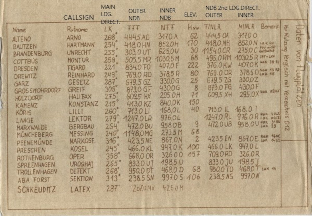All military airbases in East Germany had codenames (like "FIGARO" for Dresden), and the morse code of the radio beacons (inner/outer NDB and RSBN) always consisted of the first and the last letter of the respective codename (so FIGARO -> morse code FO). So, no ICAO codes or other four-letter codes. More info here: https://forum.dcs.world/topic/370626-rsbn-ddr-and-more/#findComment-5628192 and here: https://www.mil-airfields.de/de-rpt/ddr-funkfeuer-rsbn-de.htm There were ICAO codes for civilian airfields though, beginning with ET... (for example ETBS for Berlin-Schoenefeld airport).