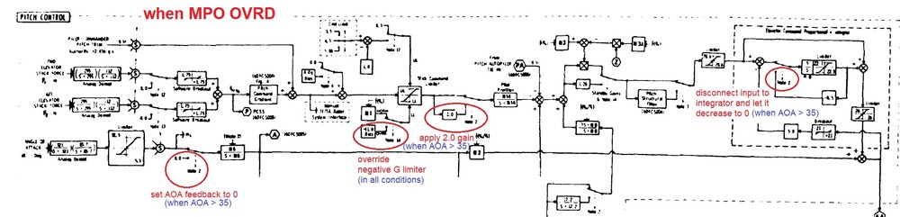 You basically won't be able to use the MPO in a dogfight unless you use it in the negative G direction. It can only override AOA limiter (actually sets AOA feedback to 0) when AOA > 35 degrees. Here's what MPO OVRD did to the longitudinal FLCS: EDIT: The current MPO implementation seems to be correct, except that the maximum allowed negative G should be -3G, instead of the current -2G. -