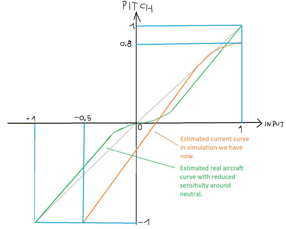 The current pitch implementation seems off from what I'd guess the real aircraft has: In the pitch up range (stick aft) after half stick deflection the full range is reached. Comparing the input window (CTRL+Enter) with the input assignment axis visualizations one can see that full pitch up is reached after about -0.5 joystick deflection. See two yellow arrows in the following image The control stick in the cockpit stops at the ejection seat handle. In the pitch down range (stick foward) after full stick deflection only about 0.8 pitch is reached. There is a range of reduced sensitivity around the full pitch down range (stick forward). See the bend before 0.8 is reached. From what I know there is a mechanism in the real plane that reduces pitch sensitivity around the neutral zero position (e.g. for high speed low level precision control). This is currently missing. This is visible in the CTRL+Enter input window and in the external view looking at the stabilator The following figure shows the current state (orange) and what I think the real aircraft would have (green) I've tested it in the cold and in the hot aircraft with Instant Action. There are no custom curves in my input settings. The pitch controls in this aircraft are fairly complex so this could be right after all. But is this really working as intended? The -0.5 joystick deflection thing has been mentioned here aswell