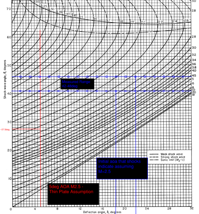 Probably being lost in translation what i'm saying is that the chart you posted lines up with what i'd expect to be the points where you get direct interaction, shock reflections directly off the opposite fin. However this does not preclude the main shocks hitting and reflection off each other (which will still chock flow) while still within a chord length of the tip of the lattice. Shocks off the lattice will nearly follow the oblique shock tables for thin plates. The angle at which the shocks will only interact with each other (as in shock off shock reflection) more then a chord length from the lattice tip can be calculated. This is why flow is still chocked even up to M2.5 not as bad as with all the shock reflections at a lower mach such as M1.5 but it is why the L/D still remains poor except at very high machs 4.0+. Ok