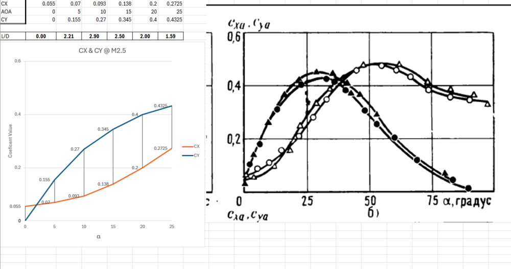 L/D of ~2.4 which is reasonable and the shock angles are reasonable close for M2.5 at 5deg. The original paper I posted was at ~2.15 L/D and Russian document was ~2.2. Also are these body axis force coefficients or wind referenced?