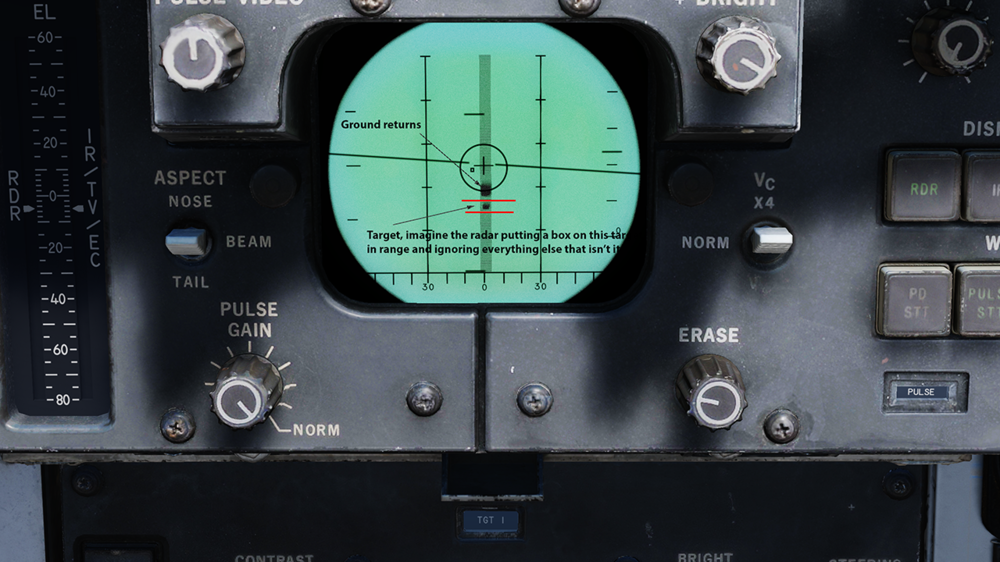 Its quite simple the radar is what's called a pulse doppler radar: Additionally techniques such as range gatting also help in the matter: A visual of the above can be seen in the F14 when it has a pulse lock and the target is separated from the terrain: Just imagine the range gate cuts everything out not within a small range (often measured in the low double digit meters to high single digit iirc) of the target.