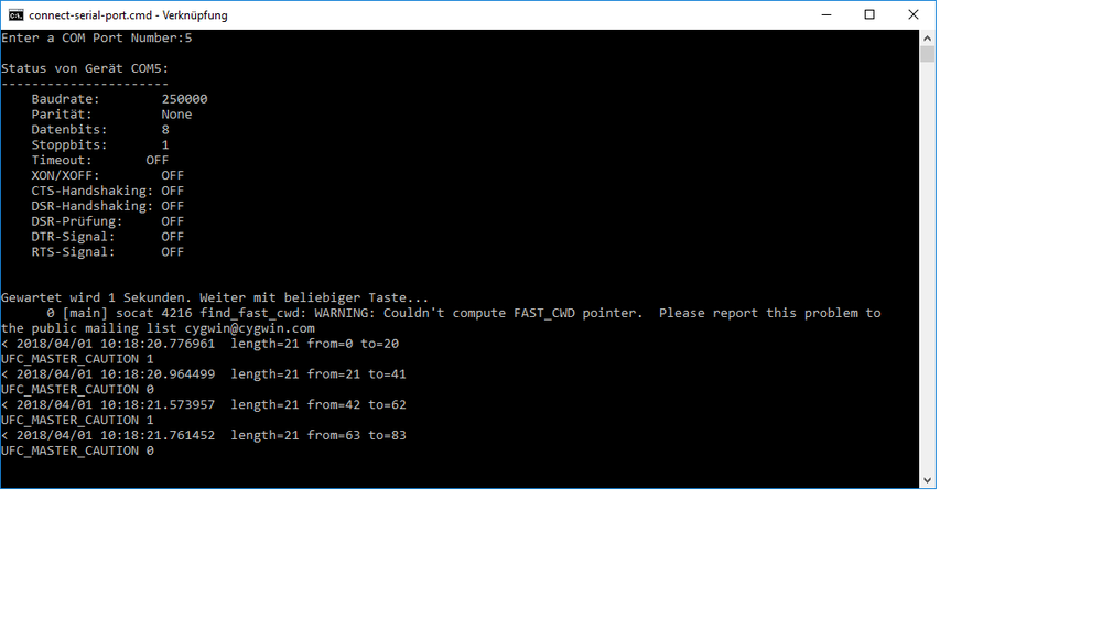 Die Baudrate wird in der DCS-Bios.h Datei festgelegt. Das hat aber nicht mit deinem Problem zu tun. Das hier ist meine Batch: @echo off REM Specify the COM port number to connect to in the following line. REM If set to the default value of ASK, the script will ask you to type it in each time. set COMPORT=ASK REM Set PROTOCOL to "TCP" if UDP does not work for you. When using TCP, REM you have to start the script after you have started the mission and the simulation REM has been unpaused, otherwise the connection will fail ("Connection refused"). set PROTOCOL=UDP set VERBOSE=-v set MODE_OUTPUT_REDIR= if "%1" == "/Q" ( set VERBOSE= set MODE_OUTPUT_REDIR=^> NUL shift ) if not "%1" == "" set COMPORT=%1 if "%COMPORT%" == "ASK" set /p COMPORT=Enter a COM Port Number: set /A TTYNUM=%COMPORT%-1 if "%MODE_OUTPUT_REDIR%" == "NUL" echo Connecting to COM port %COMPORT% mode COM%COMPORT% BAUD=250000 PARITY=N DATA=8 STOP=1 TO=off DTR=off %MODE_OUTPUT_REDIR% timeout 2 if "%PROTOCOL%" == "UDP" socat\socat %VERBOSE% UDP4-RECV:5010,ip-add-membership=239.255.50.10:0.0.0.0,reuseaddr!!udp-sendto:localhost:7778 /dev/ttyS%TTYNUM% if "%PROTOCOL%" == "TCP" socat\socat %VERBOSE% TCP4-CONNECT:127.0.0.1:7778 /dev/ttyS%TTYNUM% pause Die habe ich aus "dcs-bios-v0.7.1.zip" von der "http://dcs-bios.a10c.de/[url=http://dcs-bios.a10c.de/][/url]" page. Pfad nicht gefunden kann auch heißen, dass der COM Port nicht stimmt. Am besten die zip Datei mal runterladen und mit der versuchen.