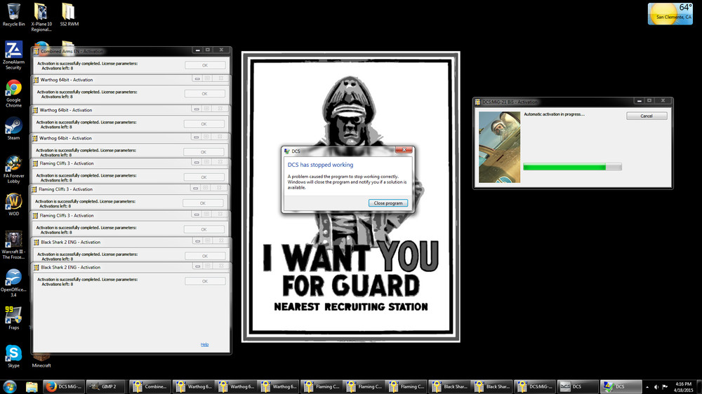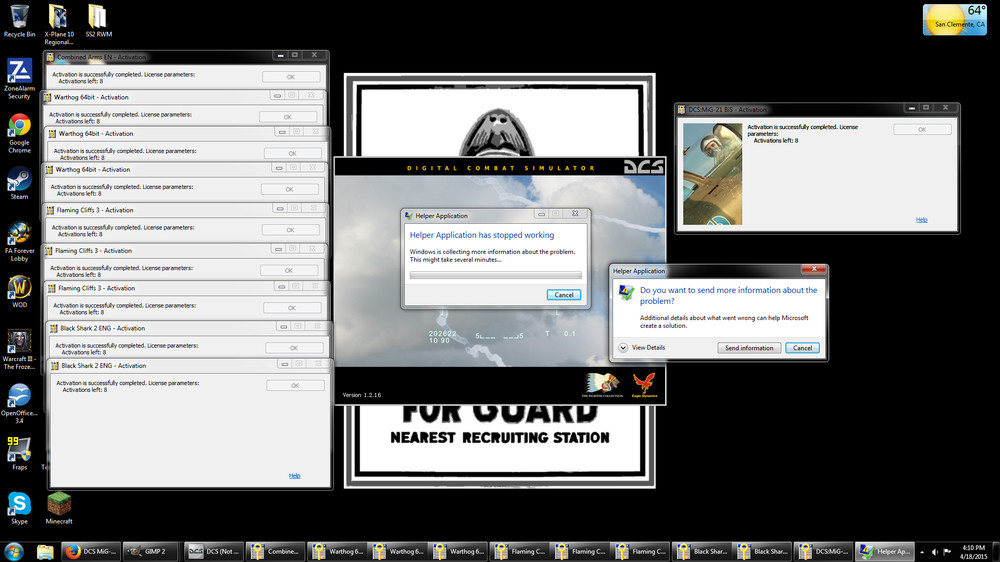 So I start it back up, load it up, and the game starts asking me to reactivate my modules again. Well not all of them, the P-51, FW-190, MI-8, and UH-1H seem to have actually reactivated successfully; but Combined Arms, Flaming Cliffs3, KA-50, A-10C, and Mig-21 never seem to activate, even though the game says they were successfully activated. No matter what I do, it keeps asking me to reactivate them every time I load the game up, and it never works even though the game says it does. I was able to reactivate the Mig-21 because I talked to one of the guys at Leatherneck, and they sent me a file that did...something, which allowed me to reactivate the Mig-21, although it took another one of my activations...