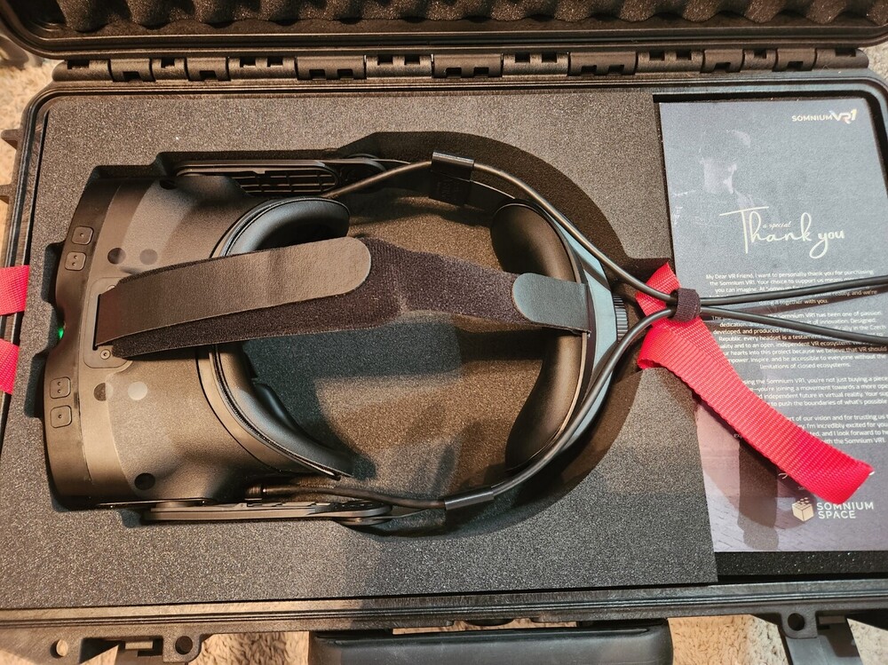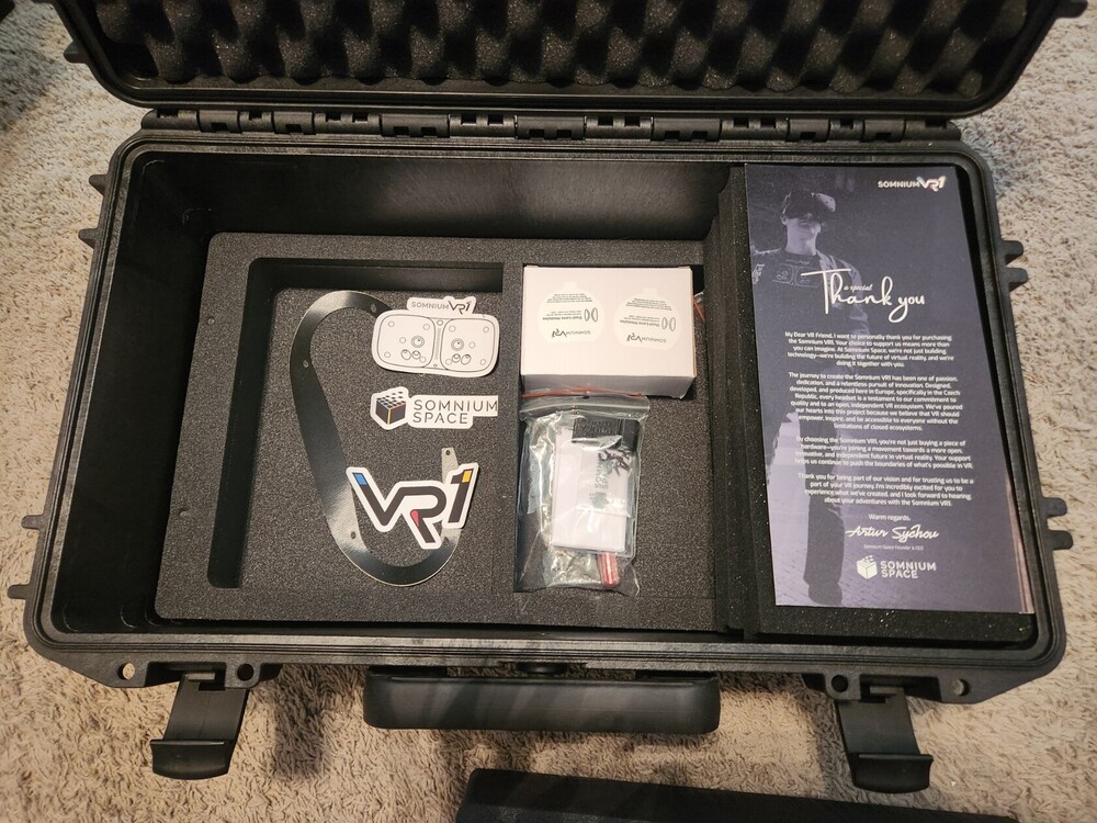 REASON FOR SELLING: I originally purchased this unit because it includes integrated UltraLeap hand tracking which is supported in DCS and MSFS. This allows for flipping switches and dials in cockpit with your hands instead of controllers or other physical controls. It also has eye tracking which supports dynamic foveated rendering in DCS. Soon to come in MSFS. The Mixed Reality cameras allow for masking, which lets you cut out the areas of your sim rig you want to see while in VR. It's a true mixed reality solution for sim racers and flight sim enthusiasts. Unfortunately for me, I've got the misfortune of having a massive head where I have to have the strap wide open just to squeeze it onto my head. That, combined with my having to set my IPD to 60 and the way my eyes are set in my head results in my just not being able to get this headset adjusted properly and squared up for my use. Best thing to do in my case is sell it and take the loss instead of cannibalizing it with aftermarket parts to try and resolve fitment problems in my case. The quality of these units is unparalleled. You will not be disappointed in this unit. It is currently the best PCVR headset available on the market and will be for quite some time. By purchasing this unit, you are getting an as new unit that is 100% functional in all aspects within the limitations of the current Somnium VR Toolkit features, which are continuously improving. You will be saving $664 over buying a brand new one as well as skipping the U.S. customs fees I had to pay to get it shipped to me. You will also be skipping the long waiting list to have yours built and shipped, which can take several plus months. My loss your gain. Here's your chance to get the best PCVR headset on the market with all available features that is literally brand-new below MSRP and have it in a few days. INCLUDED IN THE BOX: Somnium VR1 Ultimate Headset Premium & protective Travel Case with customized foam VR1 double-pad memory foam adjustable head strap, easily adjustable to various positions. 2x All-in-one 6 meter (20ft) hybrid AOC cable comprised of: Display Port (32 Gbps), USB 3 Gen 2 (10 Gbps), power functionality. Cleaning cloth Set of additional screws Set of screwdrivers Special "Thank You" Letter signed by Artur Sychov Stickers Current MSRP = $4,664 Asking $4,000. SHIPPING INFO U.S. Sales Only. Will not ship Internationally. Buyer responsible for shipping & insurance for the full $4,664 value of the unit. Will provide buyer tracking number as soon as available. IMPORTANT! This headset is PC only and will not run on consoles. Buyer is responsible for verifying their PC and associated hardware is capable of running this headset (nVidia GPUs only) as all sales are final and non-refundable. More information on this headset can be found here: Somnium Space e-shop