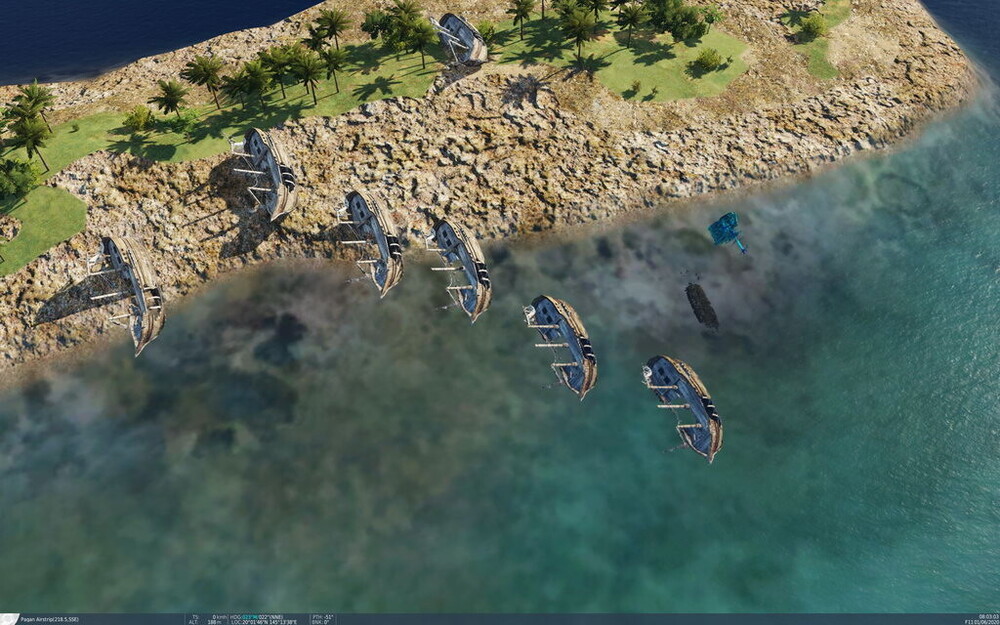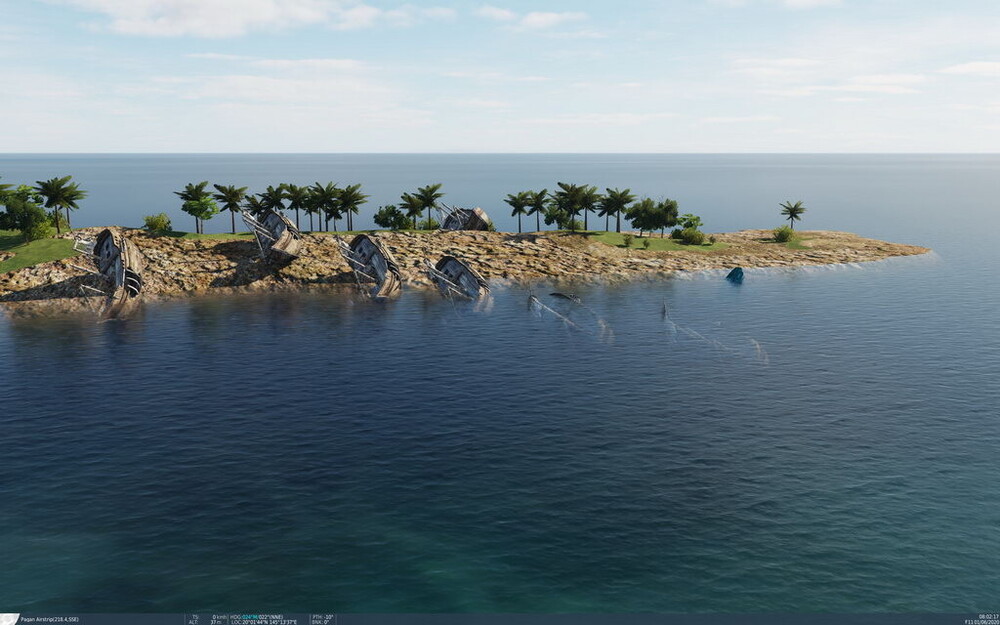 I have a number of custom shipwreck models that I would like to a) place on sea ground b) partly merge into sand/beaches Now when I place any of the models (all of category 'fortification' within 'structures') on the channel waters of N2 ─ they just float on the surface. Is there any category/type of static object where I can adjust the altitude value? Giving it a sub-zero value like I've read a few times in the past days? The very strange thing about all this is: 2.5 years ago I used the very same shipwreck models in a Marianas scenery - where they'd drop right to the seagoround of the Maug caldera. I can still load that scenery and the wrecks are still under water. Where is the difference? Any help much appreciated! EDIT: Well, I noticed it is (or rather can be) a matter of perspective/viewing angle ─ as the two attached screenshots demonstrate. However, at the time (2.5 yrs ago) when I worked on the Maug scenery that never caught my eye ─ which it certainly would have. So I wonder whether anything in the engine and especially in water rendering has changed? Or is it a setting ('water' is always 'high' with me)? Btw, my question whether there is any category/type of static object where I can actually adjust the altitude value is still open...