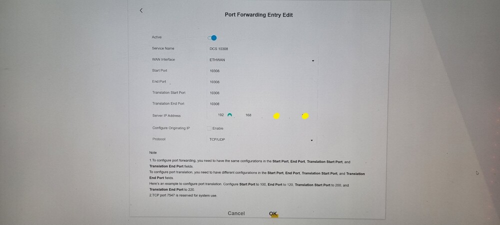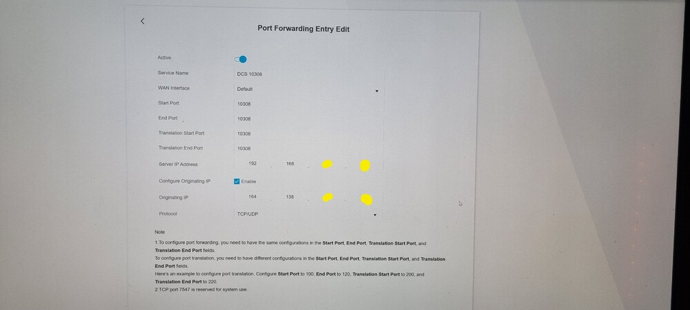 No, I've not changed it and it still says 10308 in the port box. My public Ipv4 address on "whats my Ip" is that same as the Ip address that my friends have within DCS. I'll try and grab one of them later to ping me