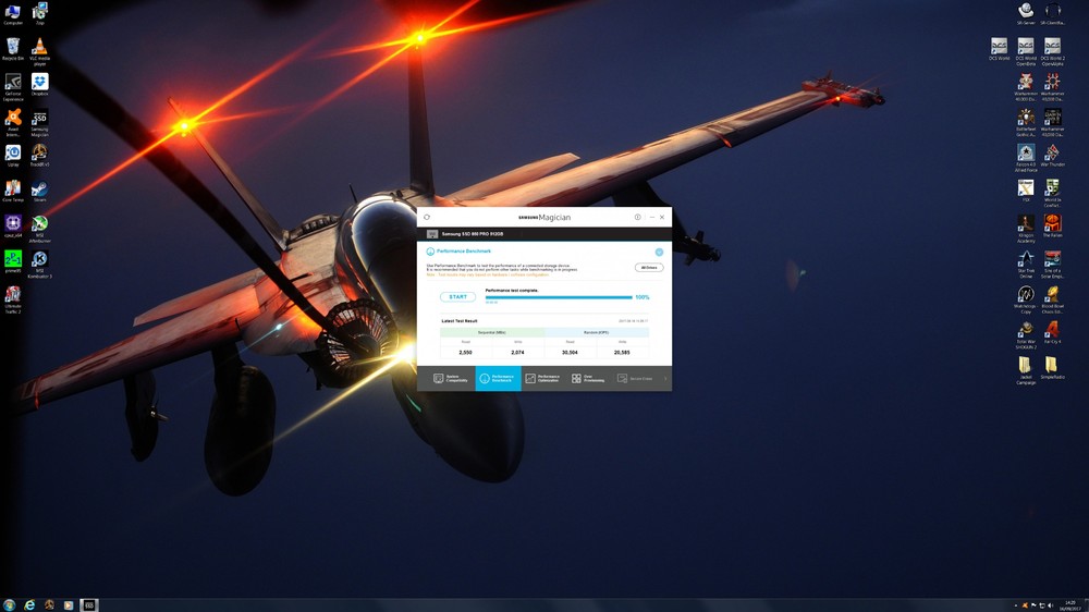 Trying to upload a screenshot, but my sequential read is 2550 sequential write is 2074 random read is 30,504 random write is 20,585 that's with RAPID mode enabled on that ssd which holds DCS, not windows 7.