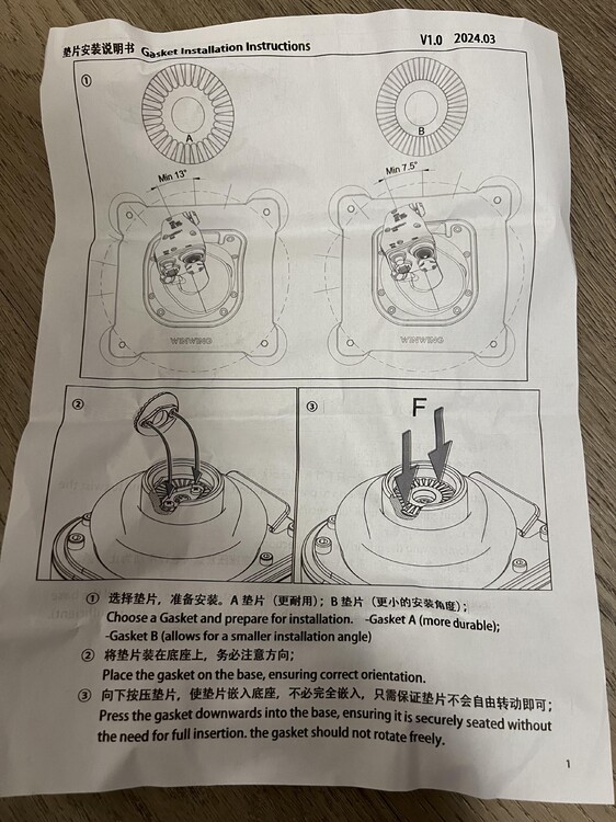 I bought a WinWing Orion 2 base with an F-16EX grip recently, and my order came with two plastic gaskets and an instruction sheet telling me to install one of the gaskets depending on how much offset/angle I want between the grip and the base. I installed one of the gaskets and now the grip doesn't screw in all the way because the gaskets are 2-3mm thick. The base + grip seem stable enough and there's no twist in there at all. Am I doing this right? Will this cause issues down the road (e.g. ruining the threads on the grip or base)? Pictures below.