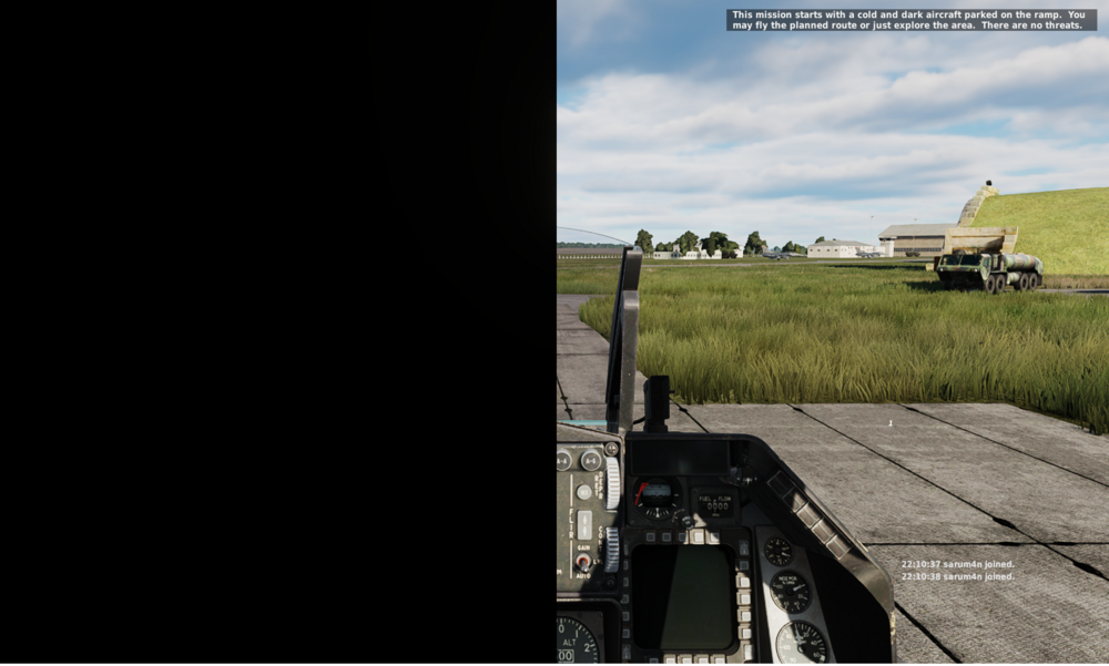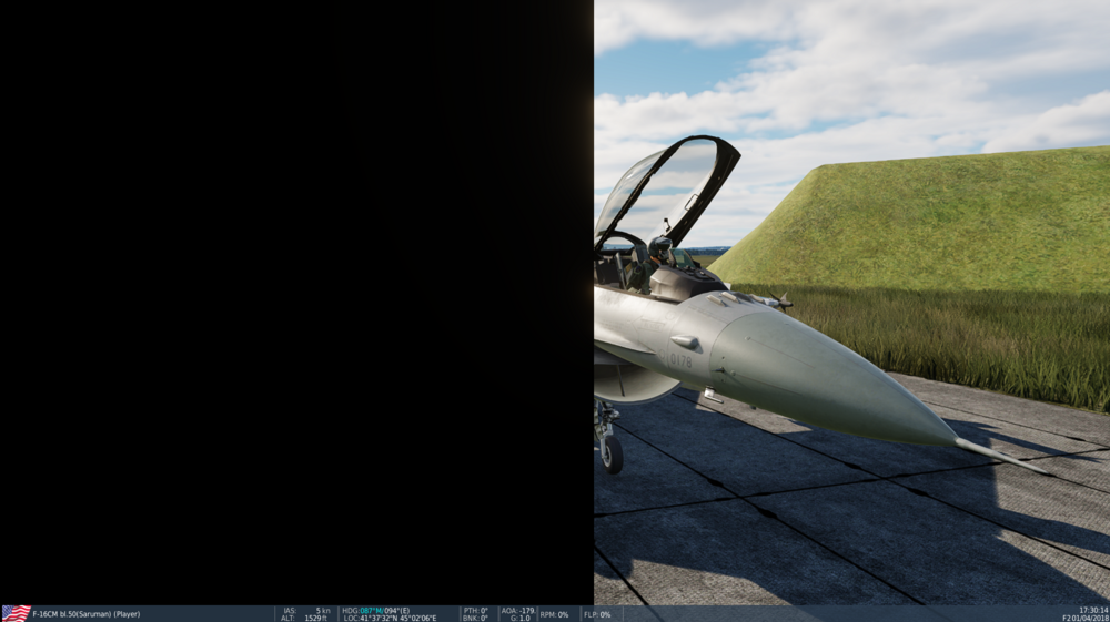 As per object, TAA + FSR draws only half of my main screen (I have 2 monitor, the main one and a little 10'' one I use to export one MFD) Cockpit bar, in the lower part of monitor, is correctly drawn for all the monitor size though (see second image). EDIT: Just to be clear, it only happens in 3D. Main menu and mission editor are ok, before you enter pit. null