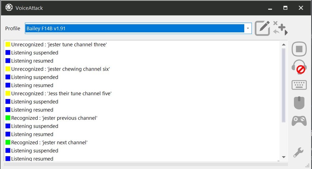 Hey Bailey, so I've followed your PDF instructions - I'm unsure though what this means, and whether it's causing the issue I have: "You can import F14BPilotKeyboard.diff.lua and F14BRioKeyboard.diff.lua if you wish." Will that change any of my joystick controls if I import them? I'm hoping not, as having to redo all that again will be a time consuming affair. Also, what is the exact command I can issue Jester to get him to tune Radio 2 to a specific channel? Btw, here's what VA looks like when I try "Jester Tune Channel X". It recognises some of the phrases, some not.