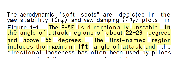 Hey I'm happy to see this post getting some engagement. I was away on vacation last week and unable to respond. I have two physical copies of the Northrop Technical Description of the F-5E/F from different dates. I got the both from Ebay Both reports have the same Northrop Report number NB 74-36, but with different revision dates. The cover to the report posted above is from 1975 version. I also have a copy the 1976 version of this manual. It contains most of the same information as the 1975 version of the same document. The 1975 Version of the document is more interesting as it describes the Air To Air Refuling System: Here's a video of the test pilot describing the flight testing of the Air to Air to refueling system and the problems they encountered. The 1975 Version also describes the planned implementation of the Maverick Missile System: The performance of the APQ-153 radar: And the expected performance of the upgraded fire control which would become know as the APQ-159. There's also a few other details and diagrams, such as the angle of operation of the throttles. That home simpit buliders like @Bucic may find interesting. null I'll post the table of Contents for the 1975 version below. I'm happy to provide scans of sections of the manual upon request. After I upgrade my scanning setup, I'll post a complete scan of both documents. In DCS I have measured the stick deflection Vs aileron angle using active pause and Photoshop. In DCS, At 50% stick Deflection, where the aileron spring stop is located: The aileron angle is equal to half of the maximum. Which indicates that the location of the spring stop (aileron limiter) and the gearing ratio of the aileron angle to control stick input in DCS is inaccurate. The equivalent aileron gearing ratio of the DCS F-5E; 18.5 Degrees of aileron angle, per 2 inches of stick movement (18.5/2). Is 1.6 times greater than the gearing ratio of the real F-5E: 18.5 Degrees of aileron angle per 2 inches of stick movement (18.5/3.2) as (18.5/2) / (18.5 /3.2) = 1.6 Thus, along the roll axis the DCS F-5E is much more sensitive to roll inputs than the Northrop documents indicate. -