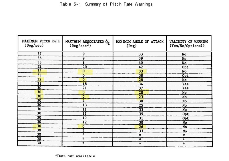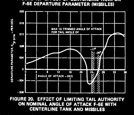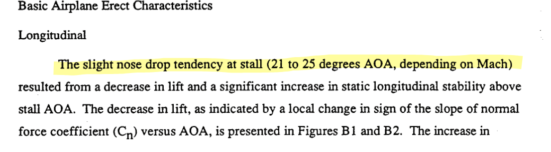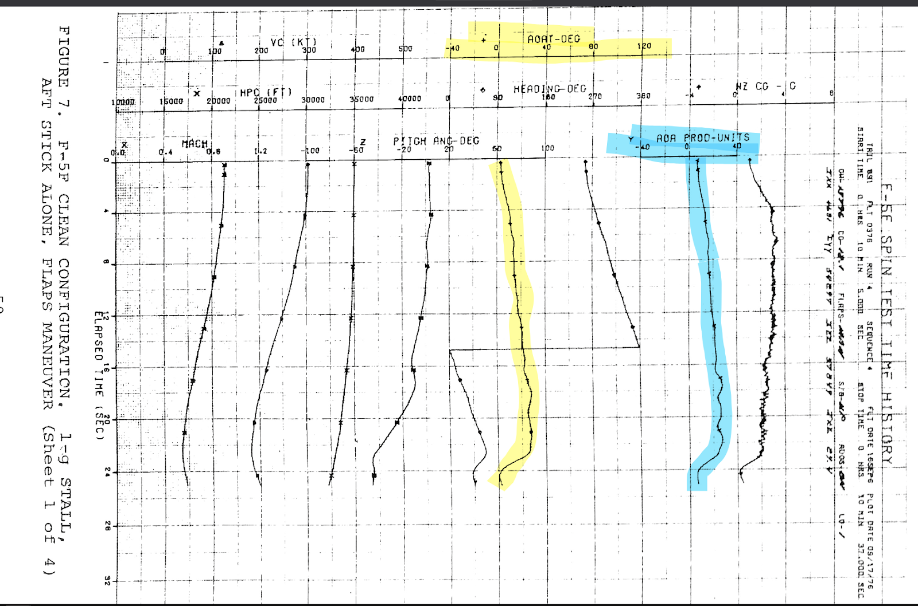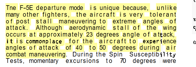 There are 2 distinct conversations going on in this thread, the conversion of AOA units to degrees, along with a discussion about AOA capabilities of the F-5E. First lets briefly touch on the conversion of AOA units to degrees in the F-5E. I have finished scanning the entire Northrop F-5E Technical Description manual and it is now posted on archive.org for free. https://archive.org/details/f-5-e-technical-description This document does not contain a definitive algorithm for converting AOA units to degrees. However, utilizing the description of the Air Data Computer from the F-5E Technical Description, along with additional data from the 1986 version of the Skow and Taylor report “F-5E Departure Warning System Algorithm Development and Validation”, The Air Force AFFTC F-5 Spin Report, And better scan of the NASA Shark Nose Report. it is possible to make a good approximation of the relationship between AOA units and degrees. Based on my evaluation of the source material, I would estimate that AOA units = AOA true in degrees * 1.1 The data and procedures used to determine this value will be provided below. Following a brief discussion of stall and max AOA’s of the F-5E. Briefly, the max AOA that is possible in the F-5E is dynamic and dependent on pitch rates, inertial coupling, and aircraft configuration. In the 1986 version of the Skow Departure Warning System paper. https://arc.aiaa.org/doi/abs/10.2514/6.1986-2284 There is a table of Maximum AOA’s, the pitch rates, and the pitch acceleration due to inertial coupling. The data was taken from F-5E flight tests and air combat training. The aircraft were configured with the CG at 18.5 to 19.0 % of the Mean aerodynamic chord. Examination of the max AOA’s obtained without inertial coupling, indicated that pitch rates greater than 30 degrees per second might be required to achieve AOA’s greater than 21 to 25 degrees. Lets now return to the issues of converting AOA units to degrees in the F-5E. As stated previously my estimate for AOA conversion factor is. AOA units = AOA true in degrees * 1.1 It is based on the description of the central air data computer, CADC, contained in the Northrop F-5E/F Technical Description. One of the key functions of the CADC is to convert Indicated AOA to True AOA for the gunsight system. <iframe src="https://archive.org/embed/f-5-e-technical-description" width="560" height="384" frameborder="0" webkitallowfullscreen="true" mozallowfullscreen="true" allowfullscreen></iframe> https://archive.org/details/f-5-e-technical-description/page/4-111/mode/1up The CADC provides True AOA to gunsight from -4 to 29 degrees, thus True AOA is reported over a range of 33 degrees as, 4 + 29 = 33 The system is accurate to +-1 degree over the range -2 to + 24 degrees. Therefore the system is accurate over a range of 26 degrees. Indicated AOA is reported from 0 to 30 Units., a range of 30 units. Let's put these values in a table to clarify. AOA Units AOA True AOA Accurate max 30 29 24 min 0 -4 -2 Range 30 33 26 Lets begin by asking if we can even assume that the relationship between AOA units and degrees is even linear in a 1g stick aft stall. I managed to acquire a physical copy of the NASA Shark Nose report and created a high quality scan of some of the flight test data. To my surprise the F-5F 1 g stall test data actually does contain a record of AOA true in degrees and AOA units. The relationship between units and degrees does appear to be linear in these tests. Which means that converting AOA units to degrees may be as simple as dividing either 33 / 30 or 26 /30. The description of the CADC gives two ranges over which AOA true is computed for the gunsight. The range in which the system is accurate to +-1 degree, we’ll call the AOA Accurate and the larger range between 29 and -4 degrees, well call AOA True. Now must decide which calibration, Accurate or True is correct. To determine the correct AOA conversion factor, we will convert AOA data from the flight manuals and test with both calibrations, Accurate and True. Then pick the most reasonable fit. AOA Units AOA true AOA Accurate max 30 29 24 min 0 -4 -2 Range 30 33 26 Deg to Units 1.1 0.866 The F-5E pilots manual states that the AOA for on speed for the landing approach is 15.8 units indicated on the dial. Lets determine the Approach AOA in degrees AOA Units AOA true AOA Accurate max 30 29 24 min 0 -4 -2 Range 30 33 26 Deg to Units 1.1 0.866 Units to Degs 1 /1.1 1 /0.8666 Approach AOA 15.8 14.36 18.23 AOA True predicts the approach AOA is 14.36 degrees. AOA Accurate predicts the approach AOA is 18.23 degrees. Now let's look at some data from the F-5E flight manual. The flight manual notes that the stall AOA for the early F-5E’s is 24 units. Lets compute the stall AOA for the Early F-5E. AOA Units AOA true AOA Accurate max 30 29 24 min 0 -4 -2 Range 30 33 26 Deg to Units 1.1 0.866 Units to Degs 1 /1.1 1 /0.8666 Approach AOA 15.8 14.36 18.23 Early FM 24 21.8 27.69 AOA True predicts the stall AOA to be, 21.8 Degrees. AOA Accurate predicts the stall AOA to be, 27.69 Let's compare the computed stall AOA’s to stall AOA from some flight tests. An extract from the Air Force’s F-5E/F Spin Report , gives the stall AOA as 21 to 25 degrees. See Pages 146 and 147. https://apps.dtic.mil/sti/pdfs/ADA319981.pdf The conversion factor AOA True ( AOA units = AOA degrees * 1.1) seems to be more accurate. As it closely matches the results of the Air Force Flights. AOA Units AOA true AOA Accurate max 30 29 24 min 0 -4 -2 Range 30 33 26 Deg to Units 1.1 0.866 Units to Degs 1 /1.1 1 /0.8666 Approach AOA 15.8 14.36 18.23 Early FM 24 21.8 27.69 Air Force 21 In The 1986 version of Skow’s Departure Warning System report. The aerodynamic stall AOA is given as 23 degrees. He also notes that the F-5E becomes directionally stable at 22-28 degrees AOA, referring to this area as the departure window. In tabular data, the largest AOA achieved without pitch coupling was 33 degrees. Skow is also