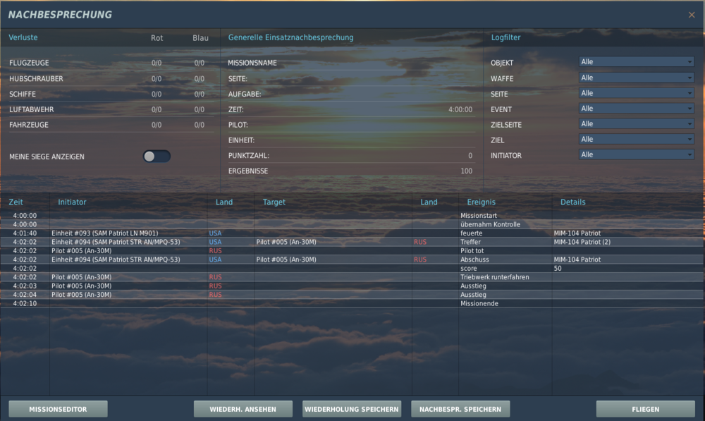 Was soll denn passieren? Wenn es ein Erfolg sein soll, wenn die Propellermaschine abgeschossen wird, musst du das auch so angeben. In den Missionszielen war "Einheit #005" angegeben. Der Name der Propellermaschine ist aber "Pilot #005". Wenn das verwirrend ist, vielleicht den Missionszielen eindeutigere Namen geben. Zusätzlich war das Missionsziel die Einheit in der vorgegebenen Zeit nur für Onlienespiele und die rote Seite angegeben. Wenn man das auf "OFFLINE" stellt, kann man es auch beim Testen im Missionseditor sehen. Wenn man das korrigiert, ist die Mission ein Erfolg, d.h. "Ergebnisse" in der Nachbesprechung ist auf 100 (mehr gibt es als Rückmeldung von DCS leider nicht), wenn die Maschine innerhalb einer halben Stunde abgeschossen wird.