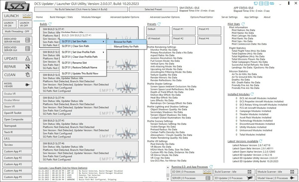 Most likely some syntax error in the command. Don't think about it, though. Skatezillas utility is indeed more convenient - it does all the things manual typing commands can do (and then some), but using faster and more friendly user interface. Back to the utility: a) right click on the "Sim Build Slot #1" button and navigate to your DCS folder (1st screen below); b) after it's done THEN you can left click on the big "No build selected / Click here to select a build" button above to choose build from the 1st slot you've just defined. Slot button will become highlighted by blue "bracket" so to speak (2nd screen below). Now the utility should be properly connected to your DCS and all the buttons on the left should start working, including the repair & cleanup ones.