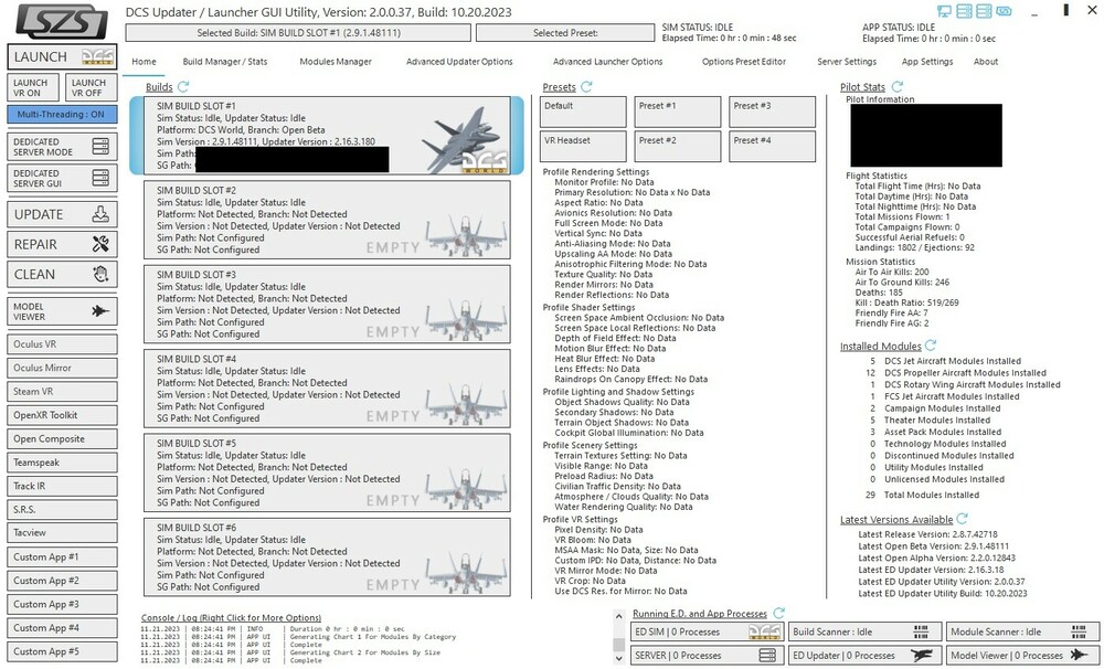 Nowadays purchases are tied to your ED shop account rather than hardware, so you're right, you won't have any problems redownloading these as long as you haven't forgot your login and password. I personally consider a full reinstall not necessary and an absolutely last-resort solution, however and here's why: a) If source of your issues is hidden somewhere inside the root DCS folder, slow repair & cleanup command should in theory rever that folder to 100% stock, vanilla state. Just as reinstall would do, but much faster. Based on my experience I'd say it does that job pretty well (although I had to use it only a couple of times I admit). b) If source of your issues is hidden somewhere inside Saved Games, then neither full reinstall, nor repair & cleanup will do anything for you anyway, especially if you think about restoring the whole Saved Games backup folder with all the who-knows-what garbage inside. If I were you, I'd start with temporarly removing / renaming that old Saved Games, doing slow repair & cleanup, then checking if the boot and freeze issues still persist. If they don't and the game runs better, then I'd start restoring only absolutely minimum content from Saved Games (like controls and logbook), followed by the other folders one by one to check if one of them doesn't bring the mayhem back. If they do persist, the culprit might be somewhere outside of DCS actually, but we'll need logs to try to figure it out.