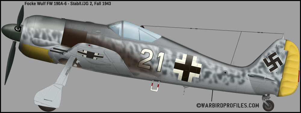 Searching for Liveries of both Units equipped with 190s JG 26 & JG 2 Operating on Normandie Coast for Timeframe of 1944 is a freaking Nightmare... So long my preferred Candidate JG2 was in early 1944 armed with A-6 and A-7 Versions dervived from loses that i found from the Squadron. The first hint of A-8 is by June from the new Staffel Leader Kurt Buhlingen, but where the Photo is taken is pretty Unkown, more likley in Germany, and the camo Scheme is pretty different from the rest of the JG2. So was more looking for comon JG2 Squadron Camo, found single black and White Picture from October 1944, from the looks of it the Camo didnt change to much since beginning 1944... The Following 190 is Josef Wurmheller died in early 1944, RLM 74;75;76 and Yellow RLM 04. Warlord if you have realy Time, would do a JG2 Squadron Skin even with these limited Resources would infinitely Grateful :thumbup: Also A6