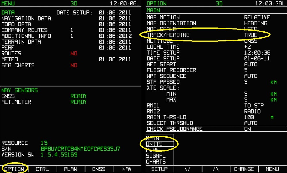 ABRIS Options I probablly should have covered this prior to lines/points, and you may or may not find this useful. Before adding lines, waypoints, or any other data to ABRIS you will want to setup some of the "OPTIONS" of ABRIS. Setting up options in ABRIS is fairly simple and can be done quickly while your Shark is starting up. When your ABRIS has completed its power up/testing cycle, you will find yourself in the "MENU" page. 1) Select FSK1 "OPTION" to navigate to the "OPTION" page, I have circled in yellow on left ABRIS screeen shot(I have combined two ABRIS screenshots into one). The right ABRIS screenshot shows you the OPTION page. I have circled in yellow "TRACK/HEADING" for information purposes. You will have two types of heading readouts in ABRIS. one being "TRUE" and the other being "MAG". Default is always TRUE North, but your mechanical guages in the Ka50 cockpit will read MAGnetic North. There are 3 types of north; Grid, True, Magnetic. But this is a lesson for a later date. Once you have arrived on the OPTION page, select FSK1 "SETUP" which will bring up the sub-menu options. We want to select the "UNITS" sub-page. 2)This will bring you to the UNITS sub-page, you will notice top left it has the current page as OPTION and right below it UNITS. Letting you know you are in the UNITS sub-page of OPTIONS. Here you can change your LAT/LON from "Degrees Minutes and Seconds"(Default), to "Degrees and Decimal Minutes". This is easier for you to get coordinates from ABRIS and enter them into your PVI(without needing to do math to convert the two). To change between the two options you can press the FSK4 "CHANGE", or simply press the ABRIS axis enter.You must change each (Latitude and Longitude) seperatley. 3) Next you may want to change some of the options for your ABRIS map. For BlueFlag generally people are using MGRS(Military Grid Reference System) to announce coordinates. If you're not familiar with map reading using MGRS, I will try and cover this later down the road. We want to start off by selecting the FSK1 "SETUP", and scrolling the sub-menu to "CHARTS" and pressing the ABRIS axis enter. This brings you to the "CHARTS SETUP" sub-page, from here you are able to add or remove the different objects displayed on the ABRIS map. We want to display MGRS gridlines on our map instead of Lat/Lon lines. Circled in yellow on right ABRIS screen shot are these two options, you will have to scroll all the way down the Charts Setup page to see these options. I don't know how to type Russian, but the top one circled is Lat/Lon and the bottom "UTM CETKA" is MGRS(UTM being Universal Transverse Mercator). 4) Here we have changed the options of the Grid lines in the ABRIS map to be MGRS/"UTM CETKA by changing it from a "-" to a "+". We also change the one above Lat/Lon from a "+" to a "-". Now you notice on the right screenshot we have the ABRIS map. It is displaying Lat/Lon coordinates in "Degrees and Decimal Minutes", circled in yellow at the bottom. And you will also see the MGRS lines on the map, also circled in yellow. The grid square identifier is a bit hard to read in ABRIS, but you get the idea. I have also circled in yellow the top portion of ABRIS, where it has "TRK 139o T. If we had changed the type of North to MAGnetic, the "T" to the right of 139o would be replaced by "M". Hope this helps a little in setting up your ABRIS. Doesn't take much time, and I think at least for me in BlueFlag is very helpful. Reaper6