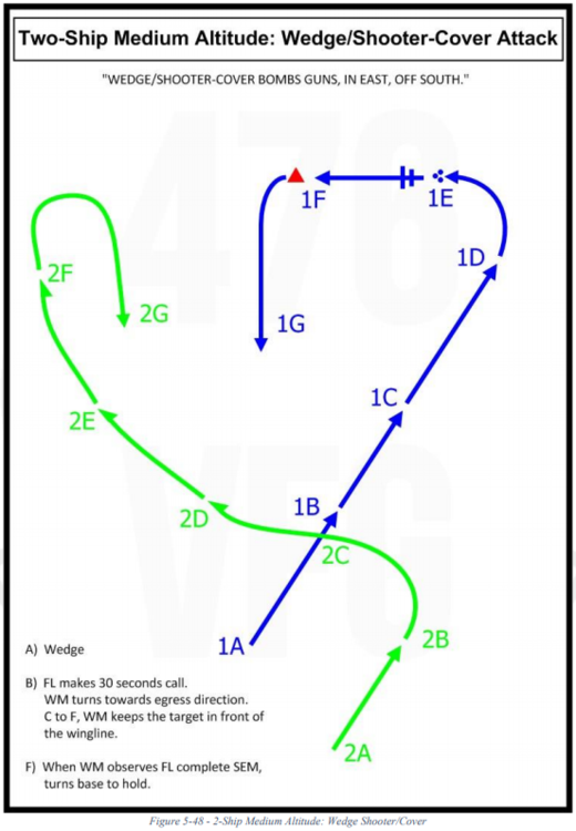 First and foremost, I'd like to thank the 476th vFG for their contributions to the community. Their publicly released A-10C TTP document is largely responsible for having made the study and implementation of effective employment tactics, techniques, and procedures possible for the community. I'd also like to thank @RyboPops for his work on the 163rd vFS documentation and knowledge, both of which have made these operations possible for our virtual squadron. At the core of every combat sortie for tactical aircraft is the two-ship element. We have all heard the phrase that one is none and two is one - and nowhere else do we find it to be more true than in the area of operations. The tasks and challenges of navigating a battlespace, sorting friend from foe, and prosecuting targets are nothing short of monumental. It is very easy for all of these factors to cascade and induce what we know as a "helmet fire," where a pilot's situational awareness, understanding of mission objectives, and flows all bust the hard deck at once, completely destroying all tactical effectiveness of the aircraft. One of the most effective solutions to the combat a helmet fire is to bring along your own personal firefighter - a dash 2, wingman, self-aviating baggage, or whatever other choice words you want to describe the second brain and set of Mk.I Eyeballs you have over the target area with you. With a wingman at your disposal, the monumental tasks demanded by employment become delegable and likewise much more manageable. A pair of jets, also known as an "element," comprised of a flight lead and a wingman, and here-after may be referred to as "lead" and "wing" respectively. Big picture, it is important to understand that flying with two aircraft over the battlespace rather than one creates nearly as many questions as it proposes answers for. It is for this reason that the wingman acts akin to an extension of the flight lead, following directives at the instruction and discretion of the flight lead, rather than moseying around all fat dumb and happy. It's no result of a personal spat or a god complex of the flight lead, despite what some wingmen may tell you, but rather a matter of tactical effectiveness. All's well here, but in any endeavor where roles are assigned, are there not responsibilities to follow? Hell yes there are, and there's responsibilities out the wazoo for both members of the element to fulfill. The lead and wing are a cohesive unit and shall co-operate and perform for better, or for worse. In military flying we call these responsibilities contracts, because when you boil it all down and let the white stuff float to the top, these contracts are simply agreements between lead and wing of what they will do, when they will do it, and how. Contracts are your friend. Know your contracts, memorize standardized contracts, and remember the golden rule of flying in a two ship: fulfill your contracts. Failure to fulfill contracts is the leading cause of shoot-downs and LPA investigations into accusations of verbal abuse by senior officers during debrief. "But Sleepy," you ask, "What contracts do I have specifically when flying with my friend?" Good question, enthusiastic aviator. Annoyingly, the answer to this question is "it depends." Generally speaking, contracts vary heavily by mission, but are always discussed and a consensus formed during a mission briefing. There are standardized contracts, things such as formation sight pictures to maintain, procedures to follow during a rejoin, or procedures to carry out a role during an employment. These standards can be set across an entire squadron, wing, aircraft type, or even as general USAF policy. To oversimplify, here are your responsibilities for your element: The single most important responsibility a member of the flight can have besides keeping the lift vector away from dirt is to remain visual with the other ship at all times. If you go blind - call it, even if it means scrubbing an employment to a cold pass or a knock it off call. Many maneuvers and employments make the assumption that both ships are tied visual. Remaining visual is the fundamental cornerstone of mutual support. And again, oversimplifying, here are a sample of objectives and contracts to meet specific for the A-10 for every flight: Accomplish a formation or interval departure, depending on weather conditions, training objectives, and live forward firing ordinance restrictions For a straight-ahead departure, rejoin to the briefed formation via the following contracts Lead will maintain 200 KIAS Two will re-join on the left. Wingmen will use 30 to 50 KIAS of overtake. Stabilize in route with four ship-widths lateral spacing. If an overshoot occurs or is imminent, advise the flight on the radio When accomplishing a change in left or right position during formation, the wingman will only do so by performing a cross under maneuver, for which the standard contracts are... [set by TTP document] Getting the idea yet? Good. The battle book is full of contracts and responsibilities for different situations. I could explain them all to you here, but I'm lazy and don't want this forum post to be large enough to be seen from orbit. So, very well done, ardent flight lead! Hopefully you've now gotten your element airborne with as many pieces on the airplane as practical and only seven non-mission critical redballs. What formation shall you have your flight utilize on departure? There's a few you can use, and they are broken into two categories: Administrative Formations Tactical Formations As you can imagine, administrative formations are used to... administrate the formation. Any time you are transiting non-combat airspace, around the airbase, or doing anything that generally doesn't involve turning enemies into dead-emies, you're in an admin phase of flight and are going to fly an admin form. There's a few you can choose from, all with different objectives and purposes, and they follow in no particu