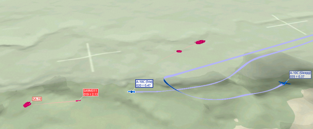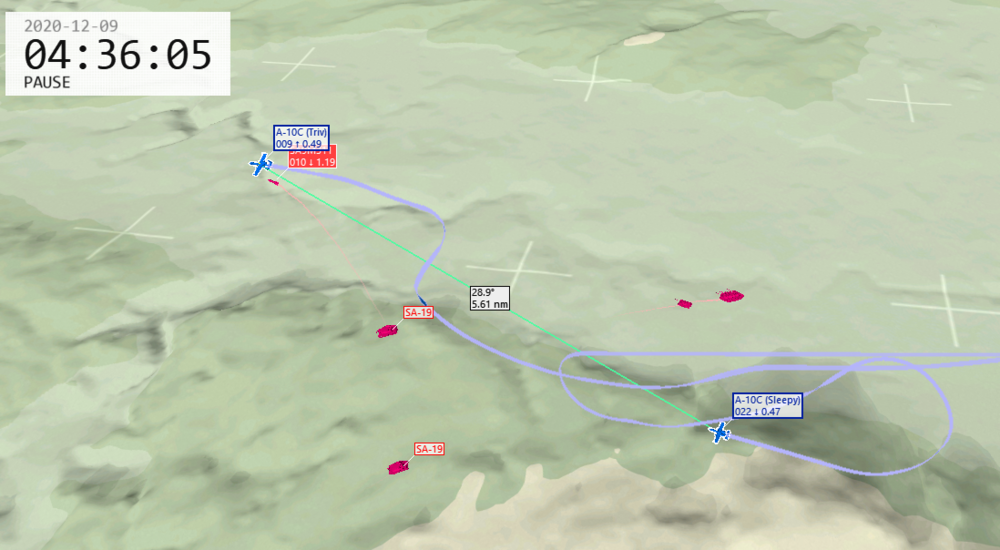 Hey Puma, thanks for the insight! A blind call from either ship really could have gone the mile here. The contracts that are executed after a blind call, should we have fulfilled them, would have whipped us into shape even before -2 stumbled into the SA-19. If that call had come from either ship shortly after my jink and reversal to the west, we could have directed a rejoin into an appropriate formation and looked to egress from the threat zone. Probably our best alternative would have been to call blind, focus on a rejoining to a formation with strong mutual support, and look to head back south where we had known there were no missile threats. From there we could have run a racetrack over the friendly FLOT until we had come up with a game plan to exit the valley. After the sortie we determined that both Triv and I needed additional training on full spectrum threat response as a two ship. Low alt pop-up threats are a real challenge because they can immediately induce task saturation and helmet fires, and that's exactly what happened to Triv and I. We went back and took a hard look at the contracts. CAF documents are clear that after encountering a threat, the standard is to defend as a flight and move to a hold. We did neither of those two things. We allowed the flight to break into essentially single ships and then continued to press with the egress. A blind call might have saved us by putting the focus back on the flight. Maybe the best course of action from there would have been a game-plan to egress the plain away from the known threat. If that for any reason was impossible and we'd absolutely must trespass the threat, we would have wanted to have made the best effort we could have to locate the SA-19s, which we knew would have been along the highway, and applied our low altitude threat egress contracts, which would be to move to a trail, approach the threat, and trespass as singletons. Element lead egresses away from the wingman, maneuvers to defeat, with -2 maintaining station outside of the enemy WEZ as essentially a cover until -1 is clear, and then -2 trespasses with -1 maintaining mutual support. Still not exactly an ideal situation, but that's an option we could have taken. Threat reactions are definitely a still weak point. Still thinking about what would have been our best options in this scenario. Any input? -