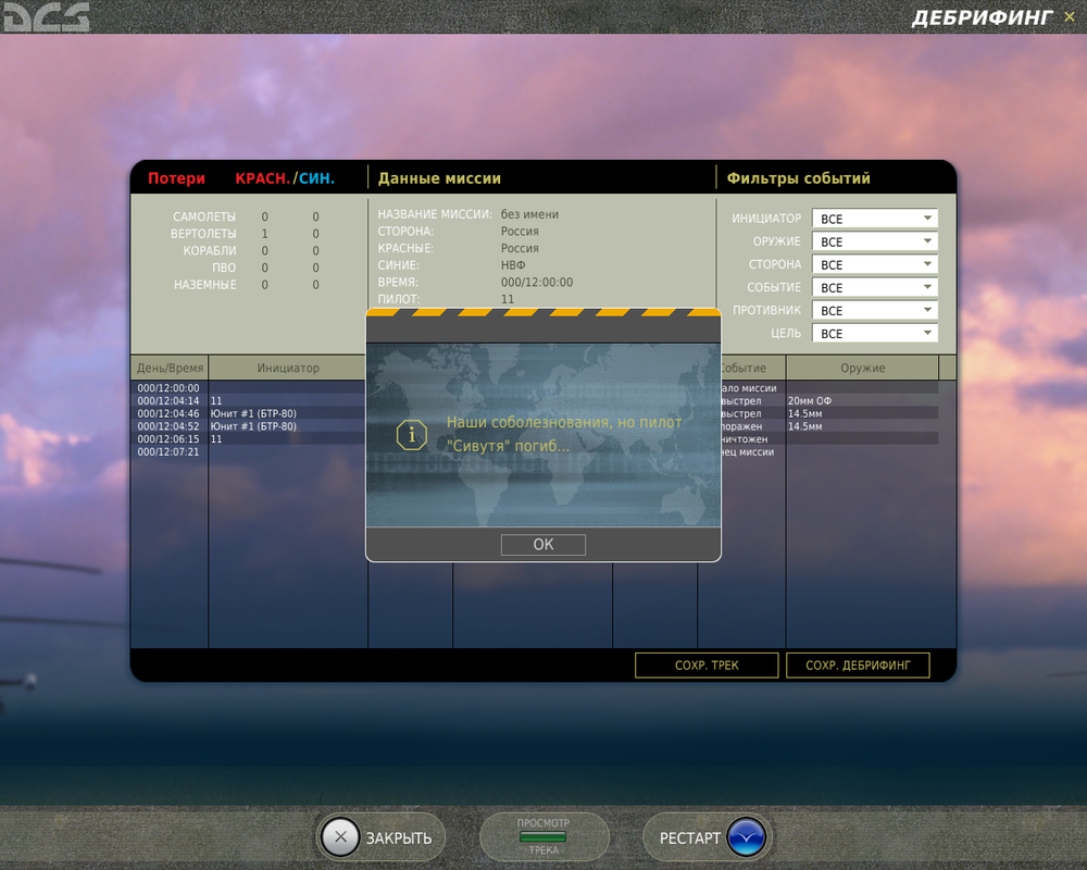 Добрый день. Во-первых, спасибо за очередной шедевр! Пока, правда, не осилил и трети мануала, но уже более-менее успешно завожусь/взлетаю/летаю и даже иногда приземляюсь Так вот о баге (по пунктам): 1) Создал в лётной книжке НЕбессмертного пилота Сивутю. 2) Сделал пару успешных (жив) Вылётов в миссии собственного сочинения (ничего нет - просто я один на вертолёте вылетаю из Майкопа, чуть покружу и сажусь). 3) В той же самой миссии добавил стат объекты НВФ - БТР-80 и солдата с АК74. (Поправка: БТР - не статический, а "наземная техника"). 4) Взлетел, подлетел к НВФ поближе (думал хоть из пушки популять попробовать), а БТР начал стрелять (неприятная неожиданность). 5) Куда-то он там мне попал, я развернулся, обратно на аэродром, жёсткая посадка (отвалился хвост) - но взрыва нет, вертолёт в целом живой, я тоже... 6) неспеша выключил двигатели, обесточил всё, открыл дверь - вуаля, я дома живой и здоровый... выхожу в меню, а мне: "Ой, вы знаете, наши соболезнования, но лётчик Сивутя погиб" Вот, собственно, и баг. Переиграл всё по пунктам ещё раз. Результат тот же. Трэк и скриншот четырьмя сообщениями ниже