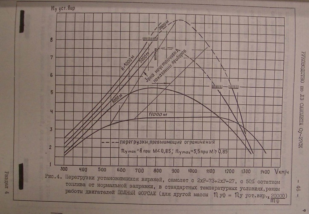 Here it is, Su-27SK max AB sustained turn diagram, the speeds are IAS here and if someone will want to compute some turning times and turn rates using the well-known formula, there will have to make transformations to find out the TAS. Anyway Su-27 radome main pitot is PVD-18 series, so there is good data and tables available to reliably do the transform from IAS to TAS. One more note – this diagram is for 50 percent fuel using the normal fuelling (also known as main fueling type). IRL Su-27 has 4 tanks: tank 1 (3180Kg) – placed along the entire airbrake length tank 2 (4160Kg) – in the middle of the fuselage, between those serious titanium spars tank 3 (1060Kg) – actually two tanks, one in each wing. 1060 is for both tank 4 (1000Kg) – between engines and in the “sting” All weights are for standard conditions fuel density (0.785 IIRC). IRL there are 3 types of fuelings: complete, normal and partial. Complete means full, normal means only tanks 2 and 3 are full, and partial means less fuel than normal. Normal fueling is the one used in routine training missions. Full fueling is needed only for long escort missions. Normal fueling means approx 55% of all tanks volume, so what you see in the diagram below is actually for 27.5% fuel! -