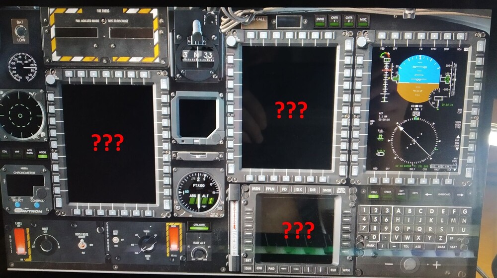 I managed to set Helios at least to the state that the right MFD works:). But the left and middle MFD and other displays doesn't show anything. The buttons on them work but they don't show the image on them:(.