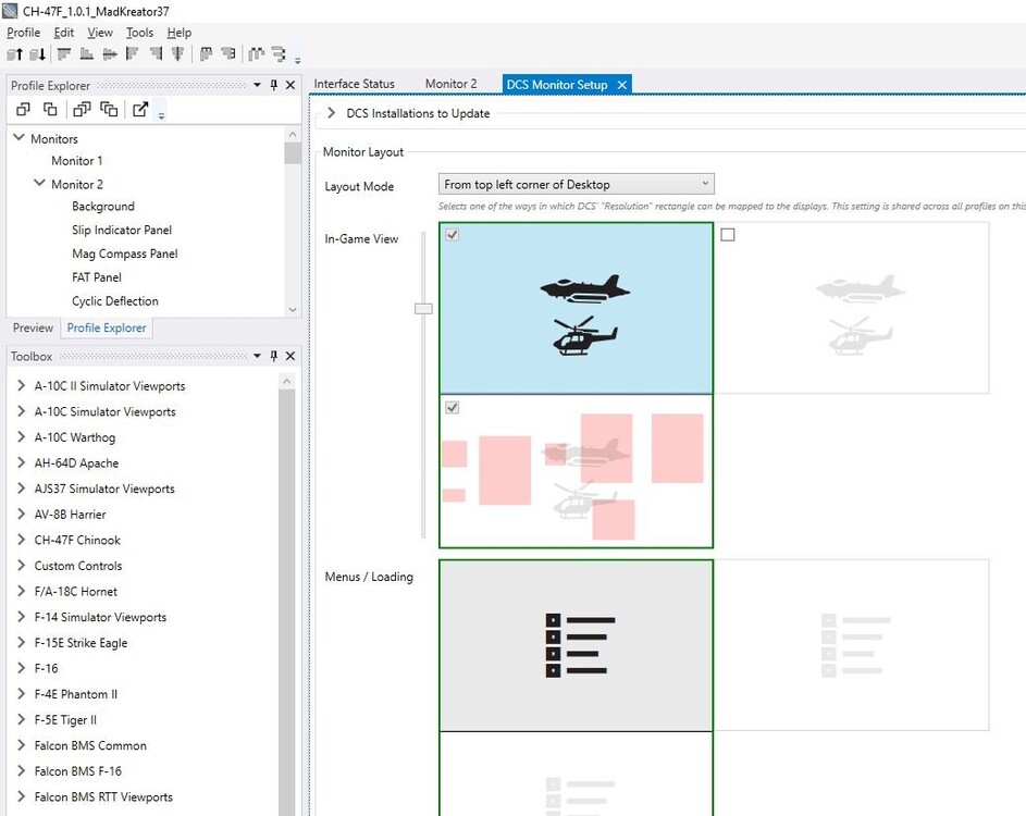 In the Helios editor, I have everything green in "Interface status", the setting in "Monitor setup" is on the picture, and in DCS I have the resolution set to 1920x2280.