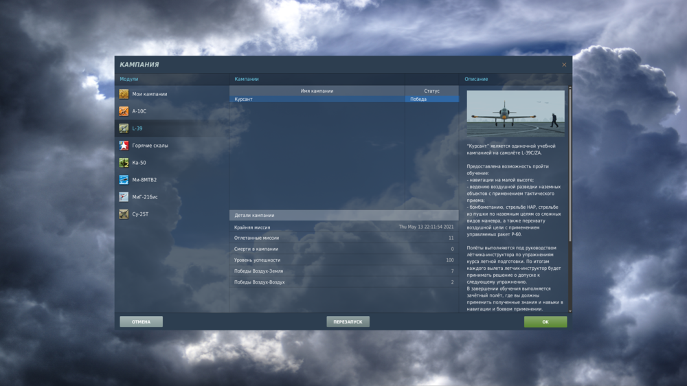 Да, кампания хороша. Очень понравилась. Теперь прохожу раз в месяц, для поддержания формы. С нетерпением жду КУРСАНТ-2, 3, 4... При этом нужно создать как более простую кампанию для новичков (различные варианты полётов по кругу, в зону на простой и сложный пилотаж, боевое применение с простых маневров), так и более сложные (групповое пилотирование и боевое применение, ночные полёты).
