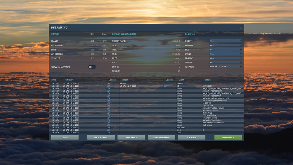 Trigger Problemsjasonbirder replied to jasonbirder's topic in A-10C Advanced Aircraft Training Qualification Campaign Can't attach a track file for the A2G Guns/Rockets mission which i've tried again this evening...exceeds upload limits! (PM me and I can share) But no Instructions after a certain point... No "G awareness warm up instruction, no fence in instruction, no hard deck is terminated instruction"... Flown the waypoints closely in terms of speed/altitude - no TOT just fly "an appropriate speed" so I cruised at 250kts