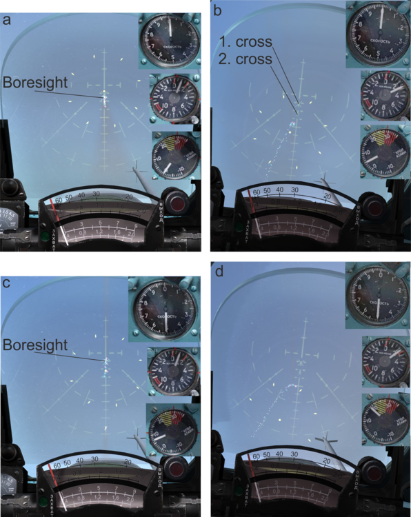 When turning the effect becomes more visible. In Figure b at 1000 km/h you can see that the bullet trail is only slightly above the pipper. But in Figure d at 500 km/h the bullet trail is significantly above the pipper.