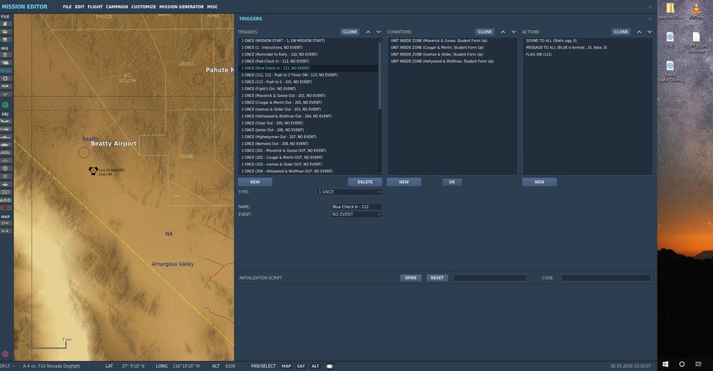 I cannot get a trigger to fire, despite my best efforts. Trigger: "Blue Check In - 111" will not fire at all. I cannot figure why. All units are inside the zone, and the trigger should fire, but it simply does not. A matching trigger for red, works fine. Can someone please have a look at this mission and see if you can get it to work? I have tested the mission from the mission editor, then hit F-10, and accelerated time. You should see Red and Blue orbit their 1st waypoints, then once both sides have arrived in their "form up areas," you should see them switch to waypoint 2, and then engage. But this is not happening, since Blue never leaves their orbit. Thank you for having a look. BTW, the mission is playable. It's A-4 vs. F-14, you may enjoy it! A-4 vs. F14 Nevada Dogfight.miz