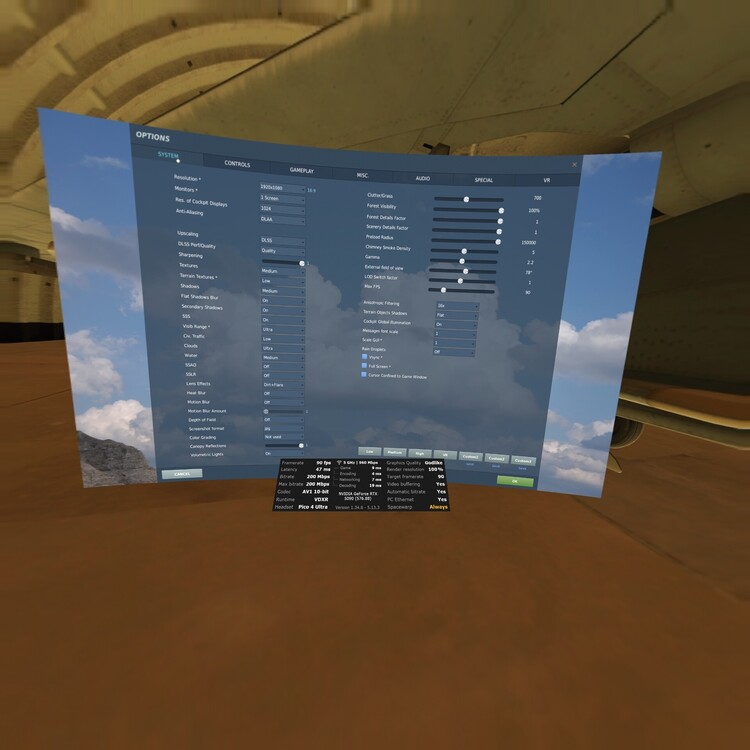 For information only, a bit of an update after getting familiar with the Pico 4 Ultra and VD. These are my current setting in both DCS and VD where I am getting very good quality and 90fps steady. In VD under Streaming tab had to disable SSW. With SSW Always enabled or in Automatic I get smearing images on aircrafts a bit far away not clear. Best to keep it Disabled
