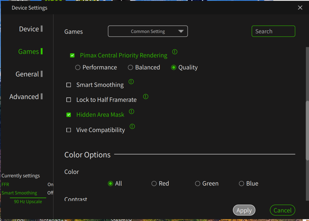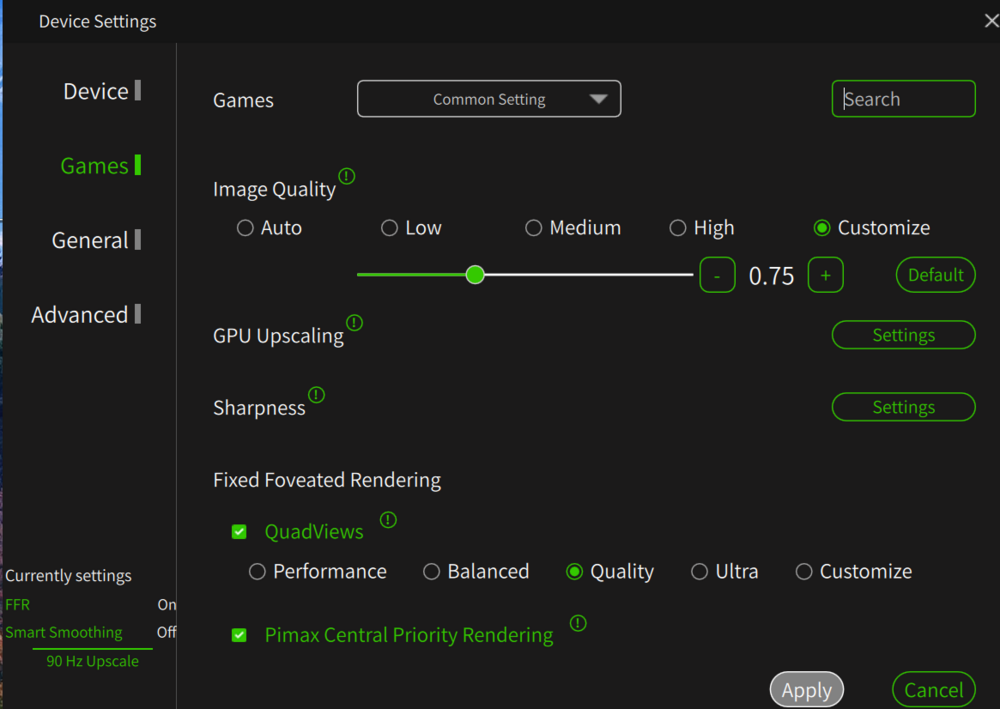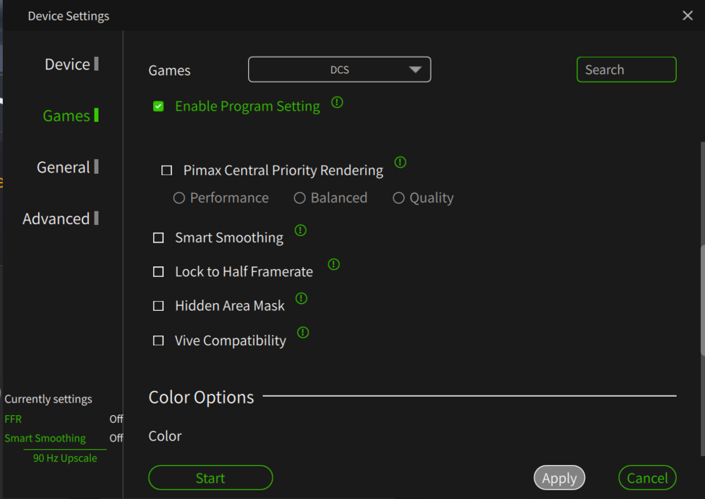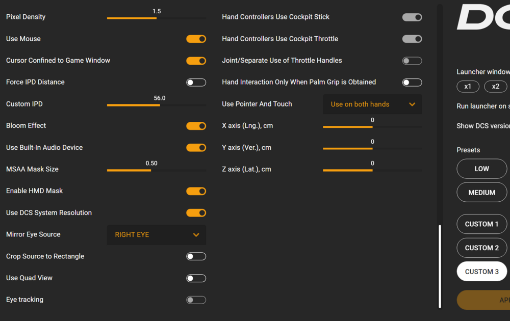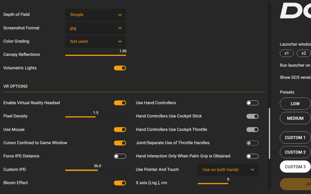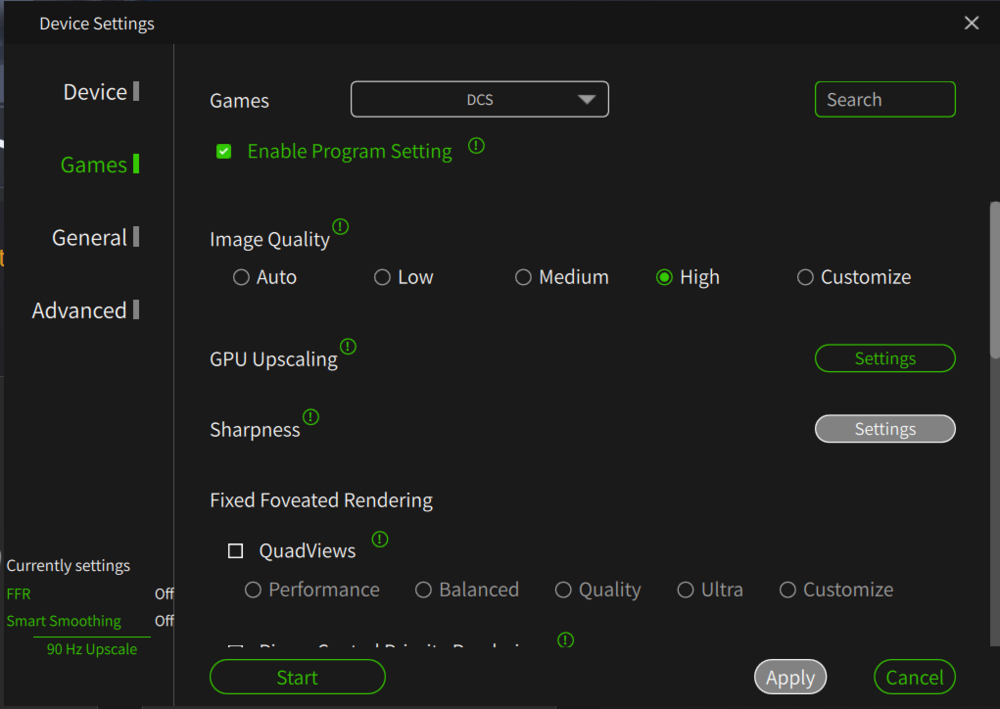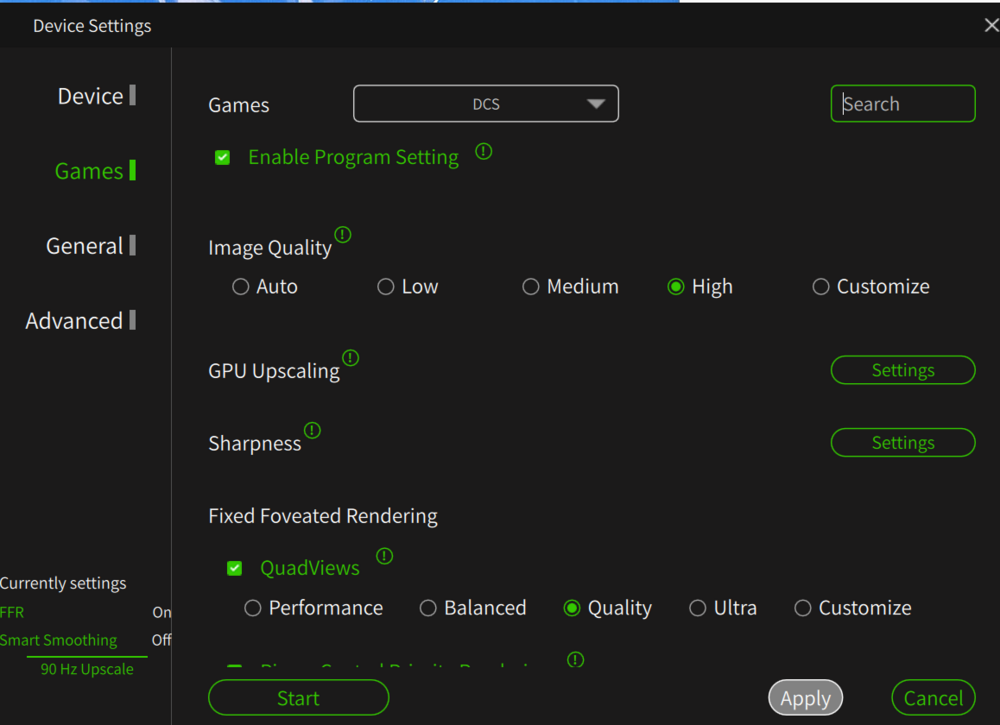 Same here getting to know my Pimax CL... Still love my Quest 3 now as a backup unit. When I started to "fiddle" with the Pimax CL I looked at the videos from the same VR Youtubers like Tally Mouse, very good video but now outdated due to the newer versions of the Pimax Play, same thing with other good videos out there. I do not know why people get lost of 3rd party add-on software I stay away from there same story with the Quest 3 lot's of 3rd party, just stay away from these. These are my best settings right now, attached. in DCS pretty much maxed out all, you just have to try, attached a setting I am testing right now. Attaching also the the NVIDA control panel, dedicated tab for DCS. By the way my system is as follows : 9950X3D, Corsair Vengeance DDR5 6000MHz64GB CL30; 2 off Crucial T700 SSD - 2TB, PSU Phanteks AMP GH1200W 80+ Platinum PSU; MSI GeForce RTX 5090 SUPRIM SOC To note that, prior this high-end built, I had outstanding results with a 7800X3D with an ASUS Dual GeForce RTX 4070 OC (72/90Hz no problem) the RTX4070 is one of the best budget GPU right now. Upgraded it to an RTX4090FE and it was perfect, did not need to go up to the current built. If you can switch to AMD build it is much better performer for DCS with VR.