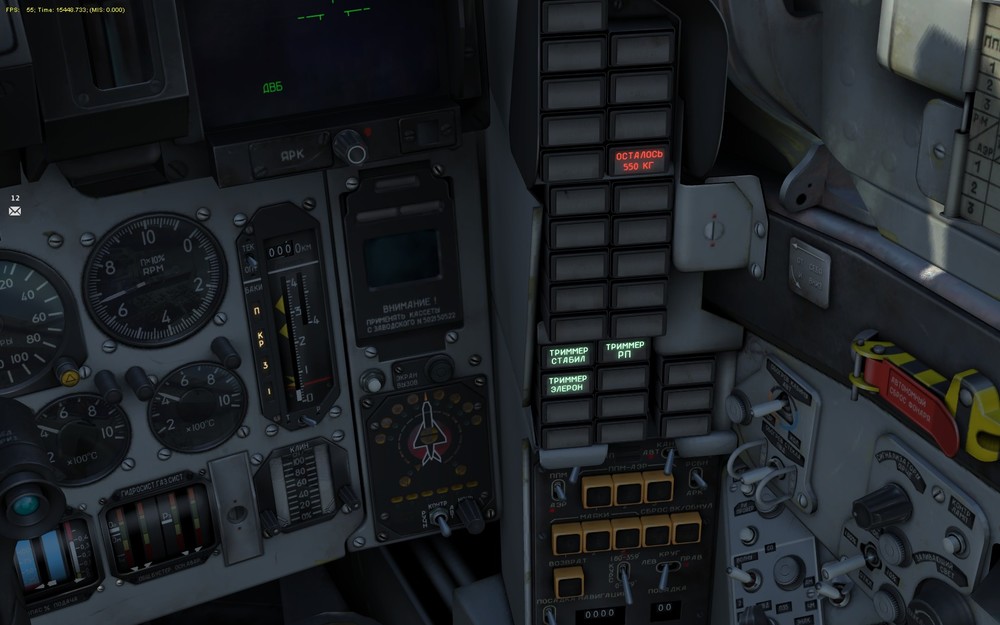 На МиГ-29 заработало табло светосигнализаторов, что очень радует, конечно. Но кажется там есть небольшая ошибочка. Отображается триммер РП, а должно, если не ошибаюсь триммер РН (рулей направления).