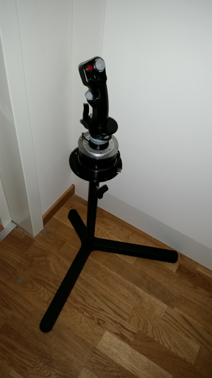 So I was walking around IKEA with my special someone, looking at stuff to buy for our new appartment. Then I saw this laptop-stand, and I got an idea. I have been looking for a joystick-stand for my TMWH stick that is hight-adjustable. I turned it over, and found that the tabletop is held to the stand via a round, plastic platform, about the size of the TMWH stick base. Some new drilled holes and it should fit nicely. And it was only $15. So I bought it, and drilled the new holes. It works like a charm! This is the table, as intended. Called Svartåsen at IKEA. And this is the result. It is actually really solid, no jiggle at all.