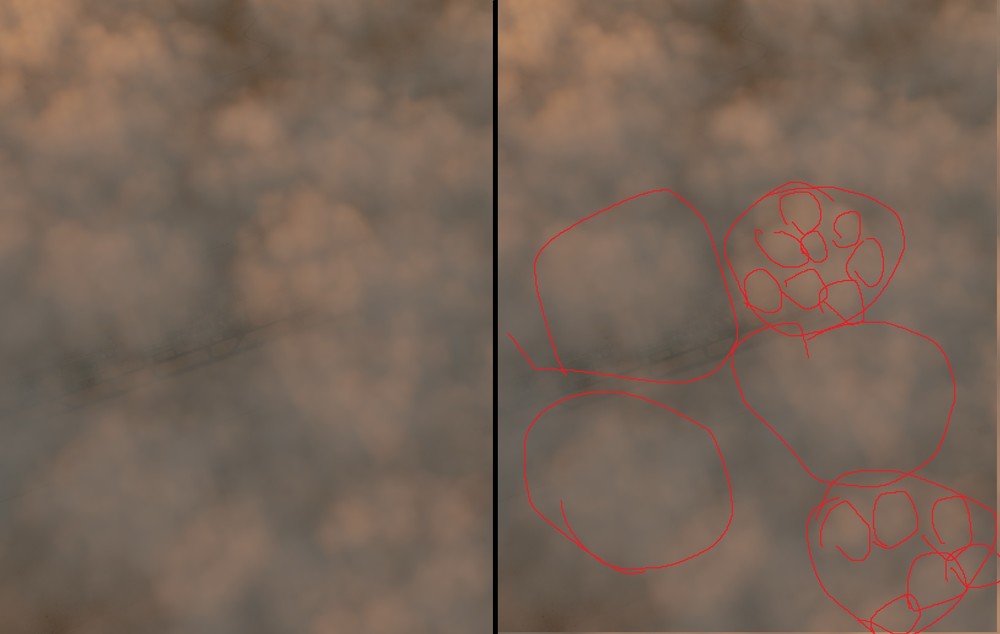I have no idea what to call this thread, and with the size of the fan club judging from the majority of the comments IRT the clouds, I'm probably in the minority and presently putting on my Kevlar vest, but here goes... This is meant for conversation and constructive criticism, not a bashing session. The cloud technology is a great step forward, the issue I'm having is, they look really fake to me. I'm not sure if it's because I do some 3D work and like watching a Hollywood movie where you have some insight in some domain and that knowledge completely ruins a movie by how much they got it wrong... the clouds look like a 3D noise texture of about 3 different sizes, similar to procedural terrain generation techniques, and I just can't unsee it. The gaps between the puff balls, at each level of the texture are just too noticeable. May I suggest adjusting your color ramp as it were, to help each cotton ball blend together so that each respective puff isn't so noticeable. Increase the size of each puff so they overlap or change the blending so they multiply together better? Picture says 1000 words? Same photo side by side, just highlighting the obvious small puff balls, which are then grouped as larger puff balls, which are then volumetrically grouped in the cloud shape volume. Photo 3 is my quick attempt to blur the midtones between the puffs to portray how I believe they would look nicer, on the left side of that photo.
