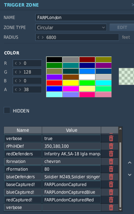 Your an idiot? I'm an idiot. I did not know that worked that way. Ok so now It starts off neutral, blue aggressors come down and instantly drive the French(neutral) out and turn the base blue including troops and service vehicles. Red aggressors come through but have to make a complete loop through the base so they can destroy all the blue units and then farp is turned red and all the service vehicles and red troops are spawned on the farp. COOL! In order to do this all I had to do was put down a farp, 2 aggressor groups with waypoints and a trigger zone and plug in some options. Now to duplicate all that it's just copy and paste 4 different objects to another location and boom done after adjusting waypoints. Awesome. On to baseCaptured. -