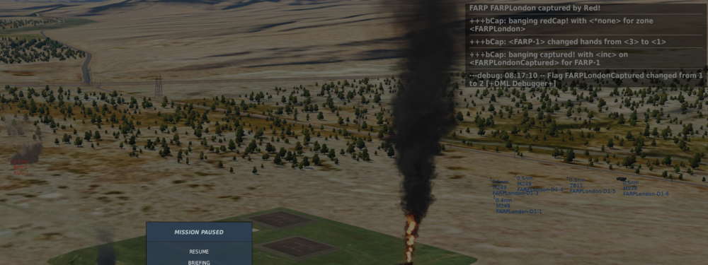 I have seen this happen off and on during testing. It will cap the zone before all the units are dead. The French are back. Probably a DCS freak show. ??? sorry pics out of order in this post Other thing I wanted to point out in this pic is the "banging redCap! with *none", different from the "banging blueCap with FARPLondonCapturedBlue". How about those debugging skills? Change your documentation at the point where you show how to doscript the modules, just go ahead and say you might as well add the debugger. Loving this thing but be sure to start it out simple, just do mark on F10 map enter in -? and the rest gets obvious. -