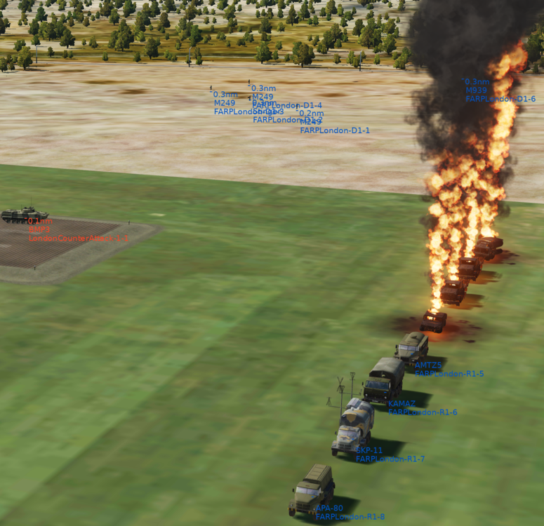 Had some comments and questions on this image. What's happened here is the BMP3, a spawner with orders to move to this trigger, but it seems to have stopped firing and has killed only 1 of the defense units and 4 of the service units. I think it's gun can't quite traverse to whatever unit it has targeted and is stuck here. So that's the image. Now I have played this scenario out quite a few times and the outcome is generally pretty (slightly) different each time, so much that it is notable. My question to Cfrag is does the spawners orders to move include any randomness in the order or the destination? There are some slight variations on the end point. The route is pretty much the same each time although when it fires rockets on blue aggressor it will miss on occasion and that alone can obviously change the outcome. I wanted to point this out to any would-be mission makers that no matter how perfect your plan DCS is going to change things up on you so be ready. Here the outcome has failed but there have been other times were BMP3 actually maneuvers on the defense units, which is quite cool to witness when happens, but it was rare. This is the point where I segway to the question or problem that should be quite clear in this test mission, the Capture Circle Jerk (CCJ) that is performed by the static aggressors. CFrag do you have any tricks up your sleeve for this? I have remedied the problem before by spawning defense units only in randomized trigger zones and the static aggressor's path was set to travel through all the possible defender zones but there is the problem of defilade. I read somewhere in your docs about the Guard orders and how a unit will respond to and I'm assuming maneuver on, and here is an important distinction, detected units or units that are within the defender's trigger zone, which is it? My wishful line of thinking is how cool it would be if the afore mentioned BMP3 could maneuver on everything in a zone whether it actually detected it or not so in the case of the BMP3 it could be shifted into a guard mode and then attack the remaining units in a contended zone after its initial arrival. Maybe DML can't handle this directly at this time, but I bet its capable of handling the situation a little more eloquently than CCJ. I suppose another angle could be the zone defense units, any way to shift them to guard orders after they are placed? -